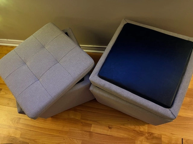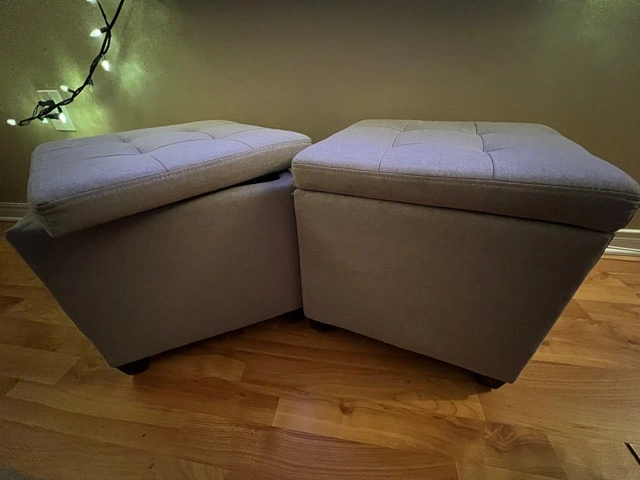These used storage ottomans are a stylish and functional addition to any living space. Featuring a tufted top and ample interior storage, they are perfect for decluttering while providing extra seating or a comfortable footrest. There are a few small blemishes, but they are otherwise in good condition. If the ad is up, they are available! Roughly 16” x 16” x 16”. Cash accepted.