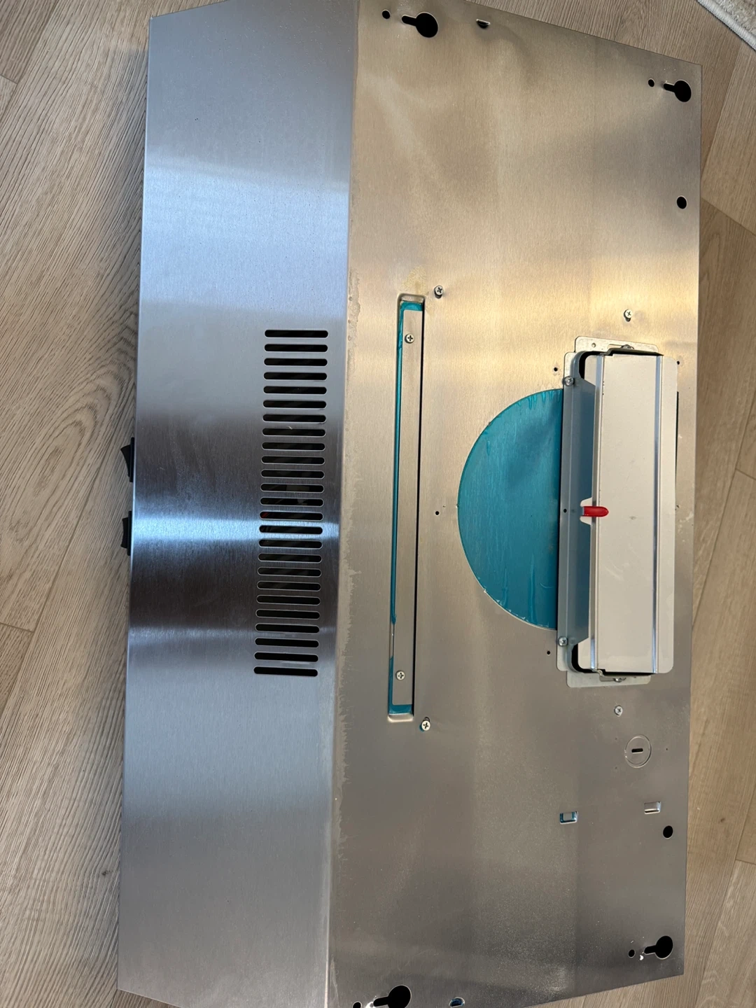 This is a stainless steel range hood. It's made of durable stainless steel material. It has ventilation slots on the side. This would be useful in a kitchen.