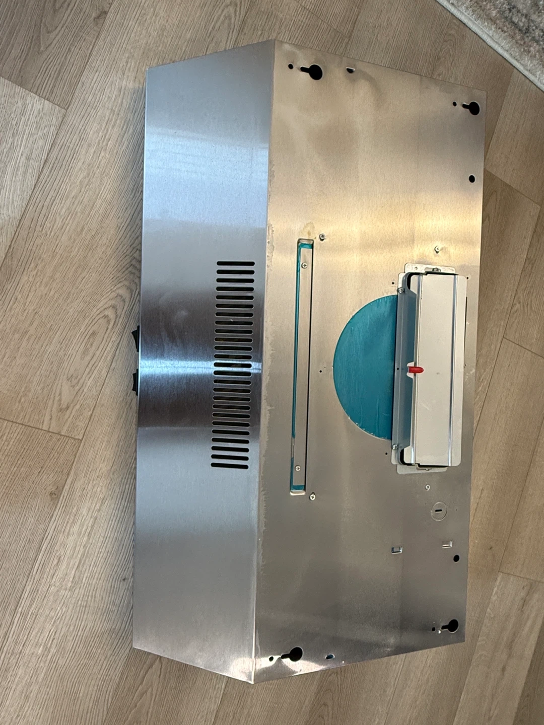 This is a stainless steel range hood. It's made of durable stainless steel material. It has ventilation slots on the side. This would be useful in a kitchen.