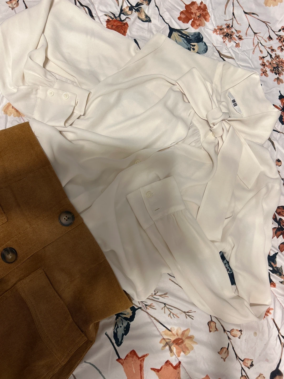A stylish white UNIQLO blouse with a bow detail and a brown Essue corduroy skirt, S