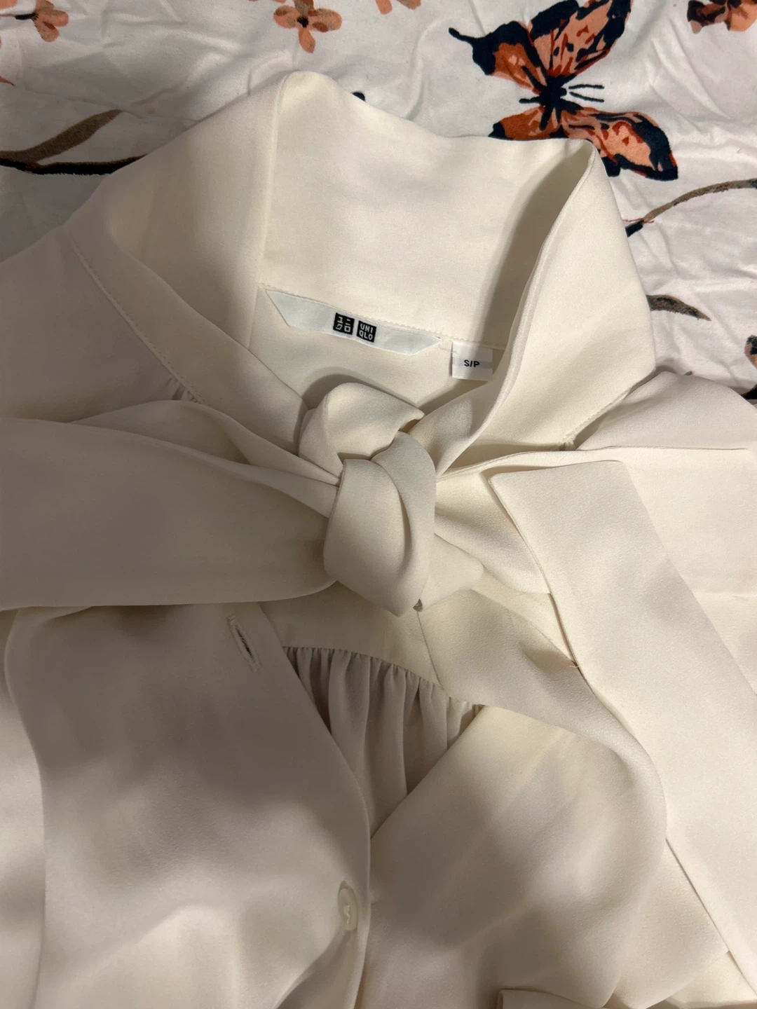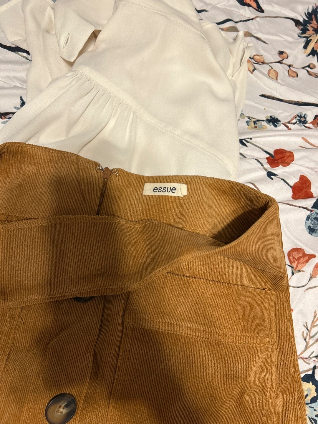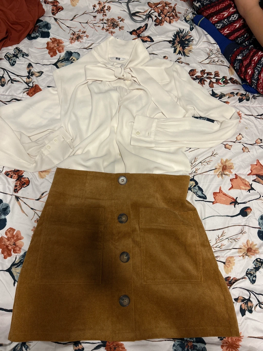 A stylish white UNIQLO blouse with a bow detail and a brown Essue corduroy skirt, S