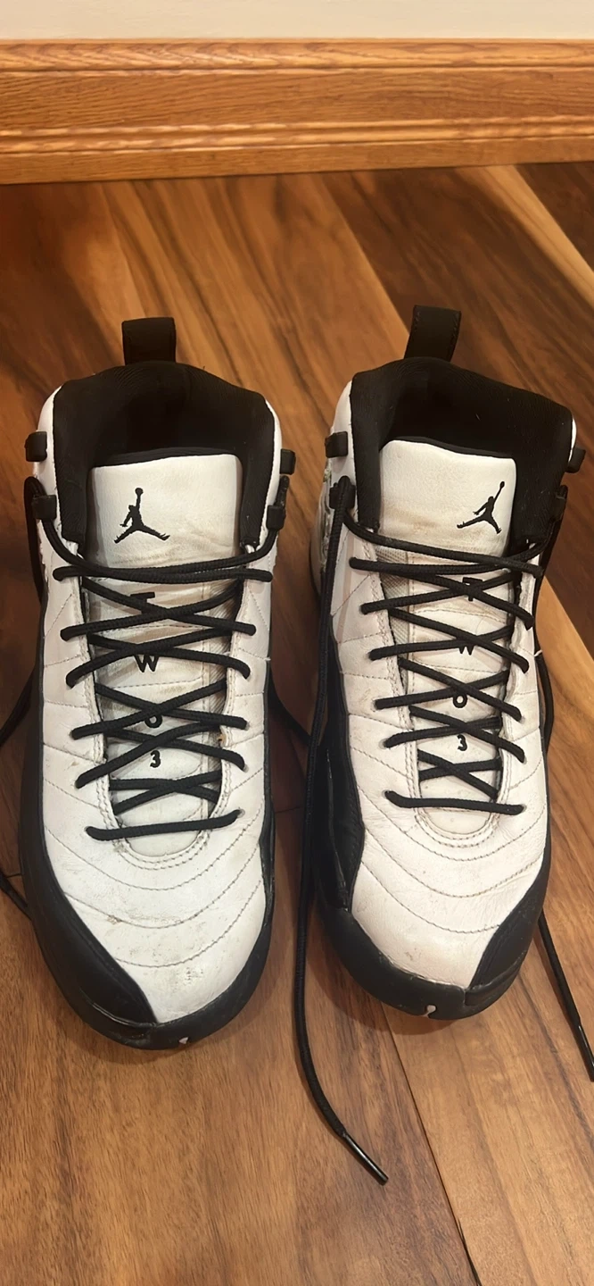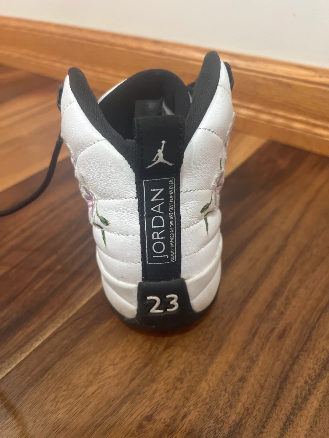White and black Air Jordan 12 sneakers with floral embroidery. Features "Jordan" branding and "23" on the heel. The shoes have black laces and black accents.