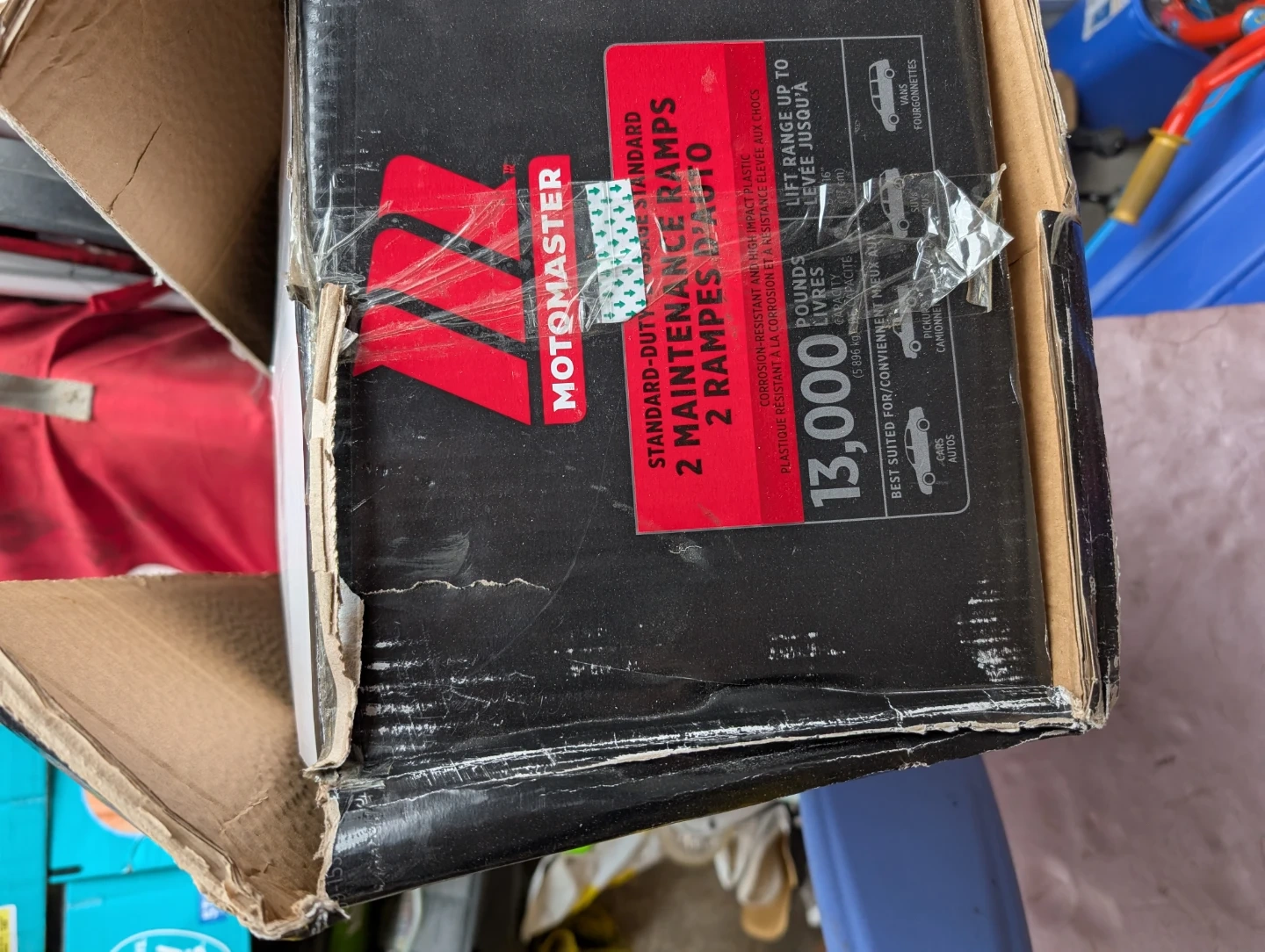 Motomaster standard-duty 2 maintenance ramps. Corrosion-resistant and high-impact plastic. Each ramp supports 13,000 pounds. Best suited for cars and trucks.
