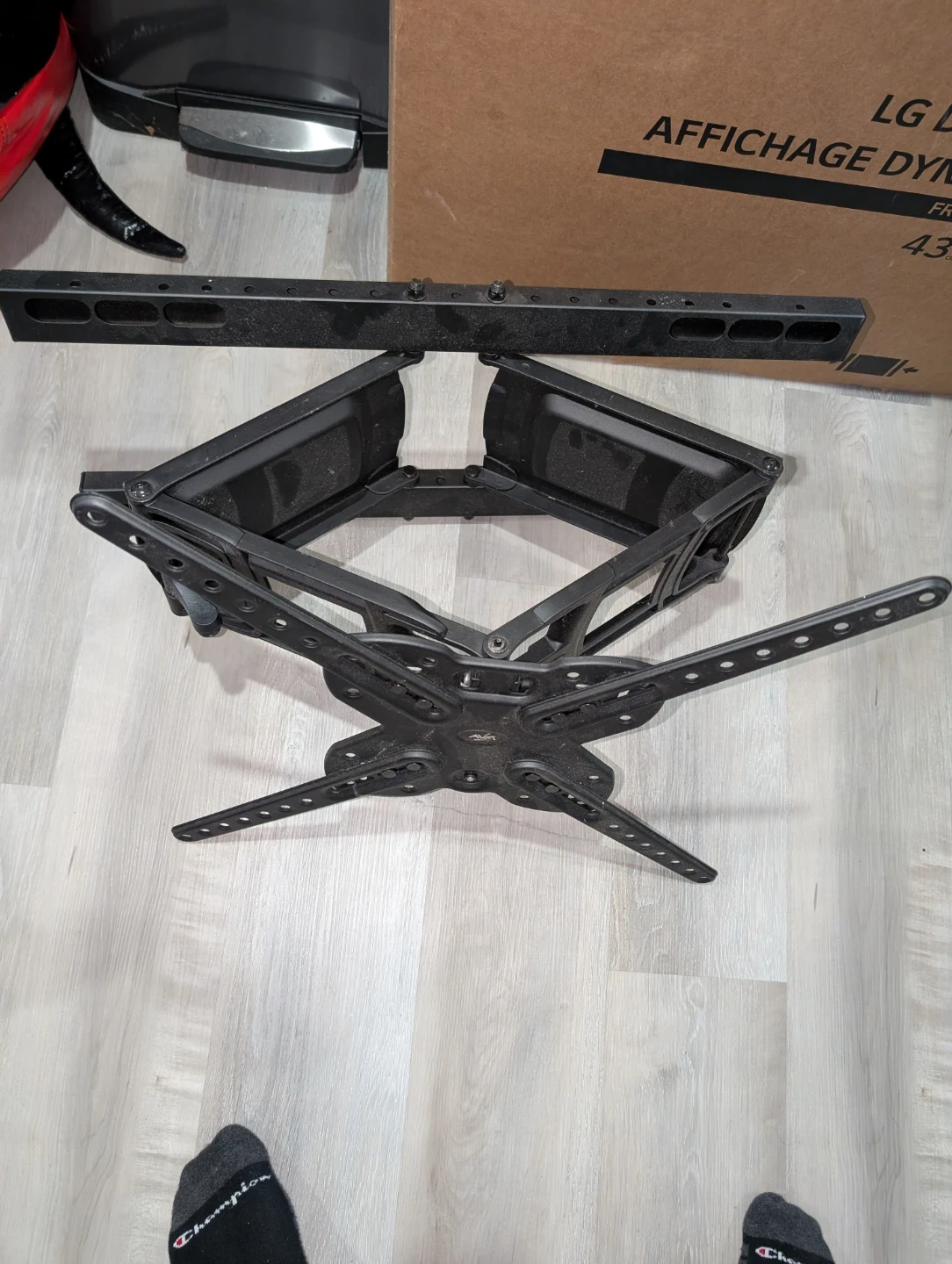 This is an adjustable TV wall mount. It's made of black metal. Mount it to your wall for a clean setup! This is for large TVs. No hardware