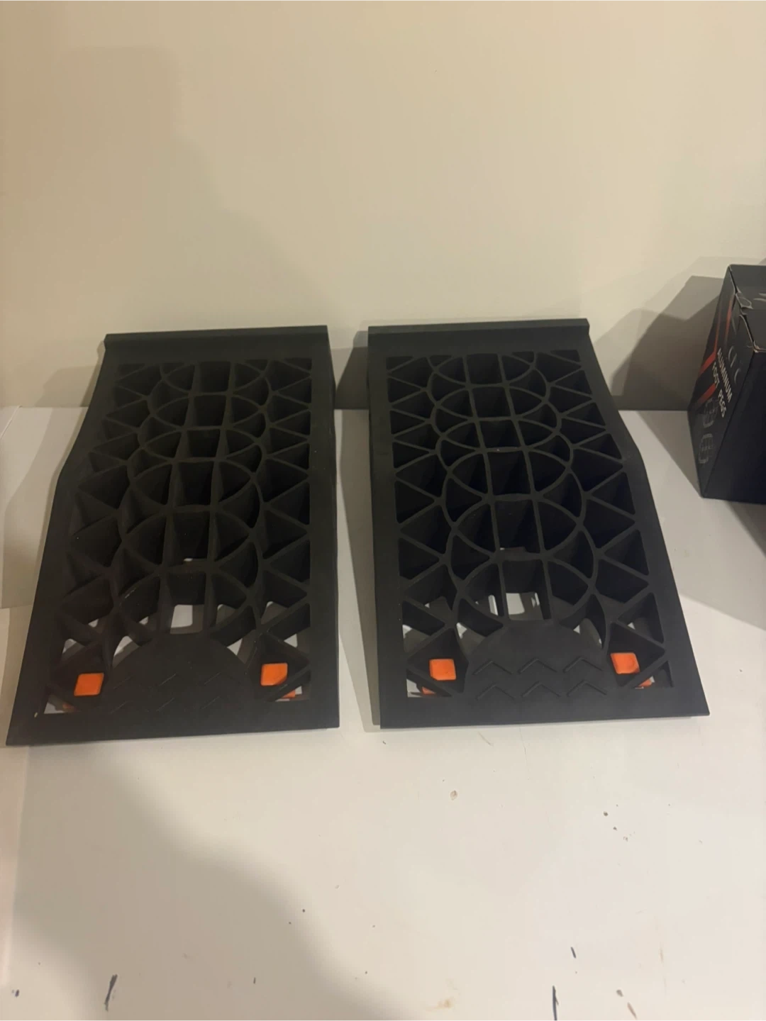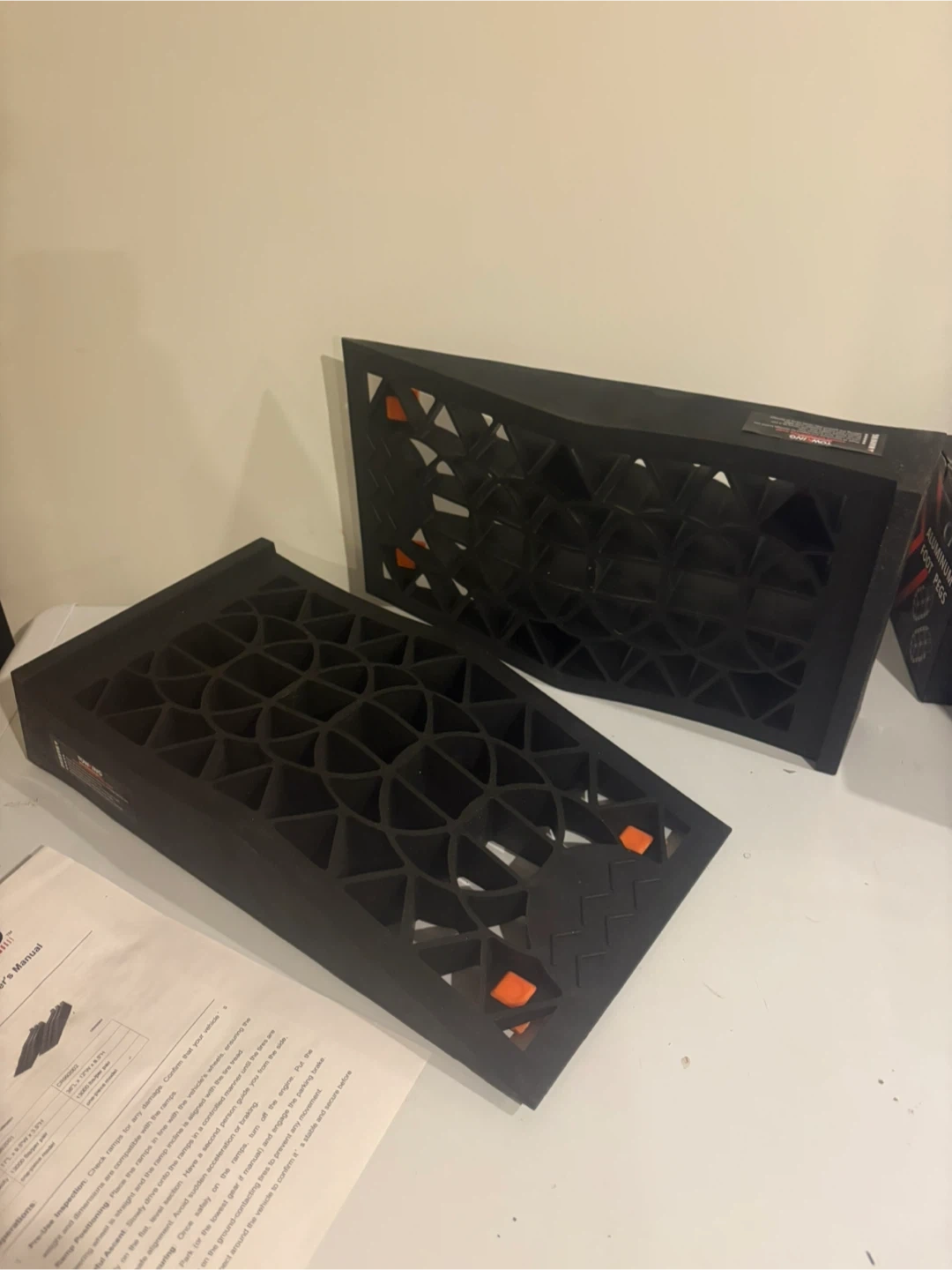 A pair of car ramps, Each ramp has a weight capacity of 13000lbs per pair. They're made of durable material and are designed for vehicle access. Ideal for low-profile vehicles needing a bit of extra clearance.