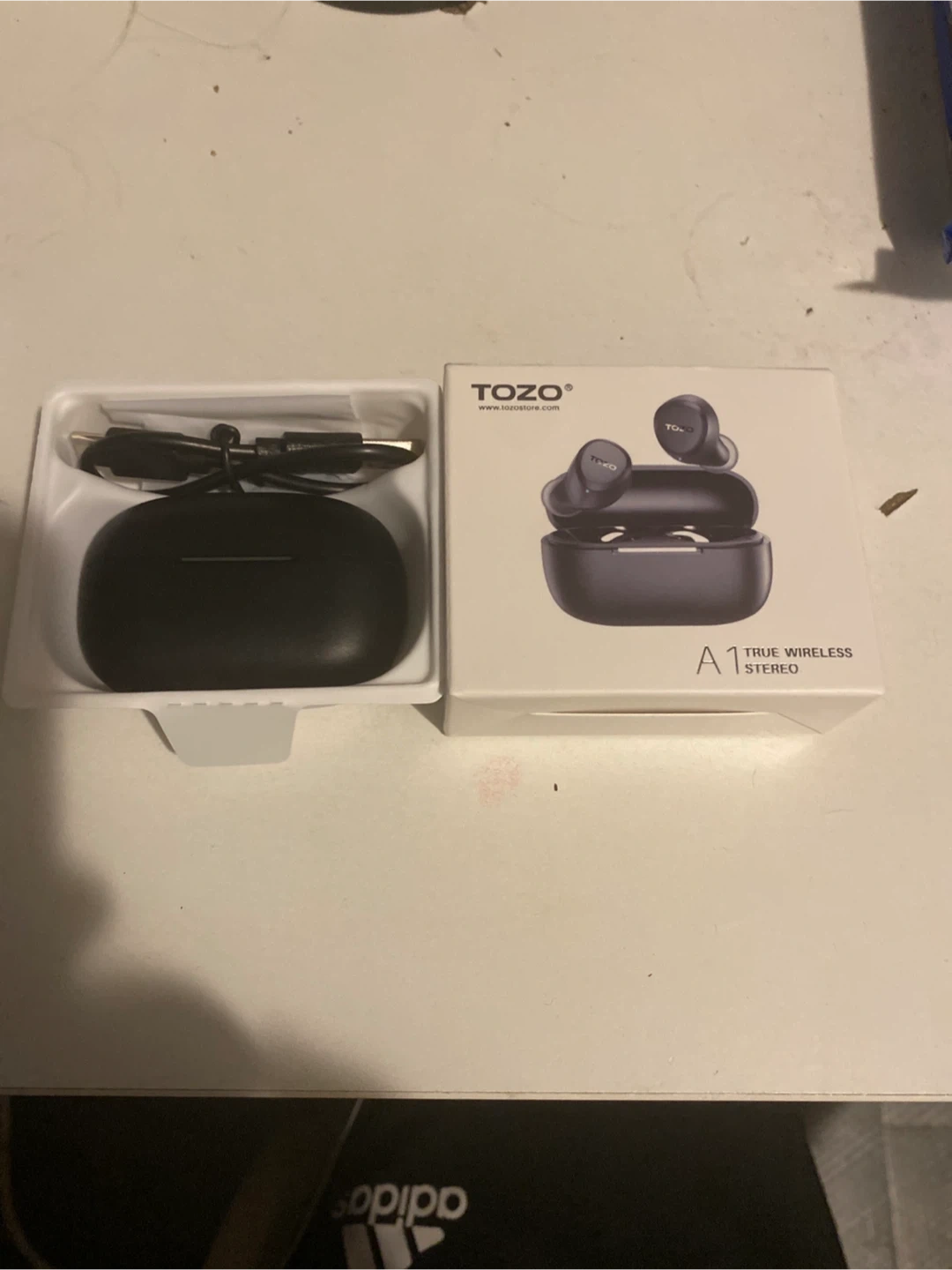 Black TOZO A1 true wireless stereo earbuds. Includes charging case and USB-C cable. Enjoy cordless audio.