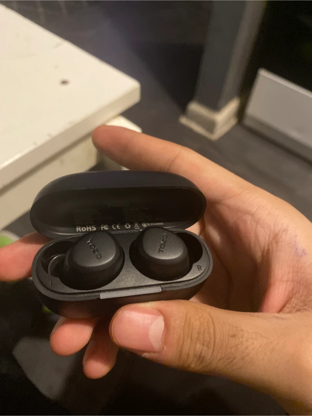 Black TOZO A1 true wireless stereo earbuds. Includes charging case and USB-C cable. Enjoy cordless audio.