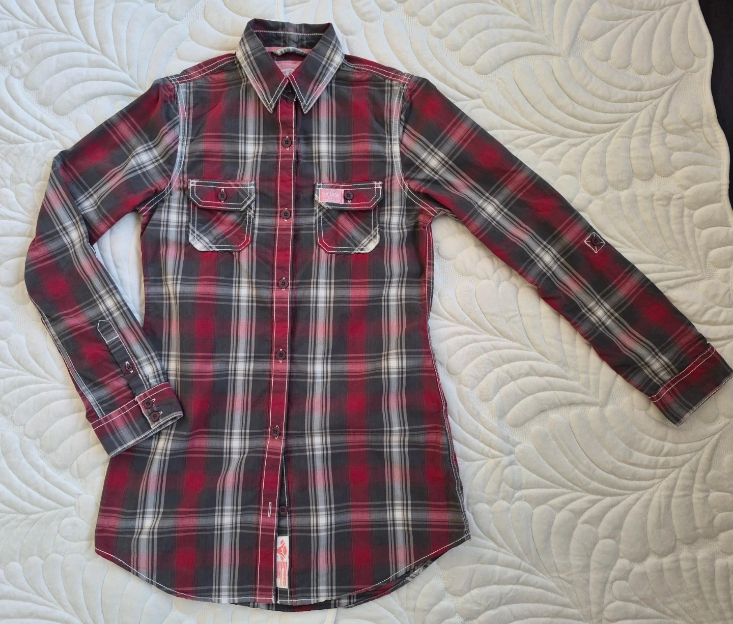This is a Superdry long sleeve plaid shirt. It features two chest pockets with button closures. The shirt is made of a cotton blend for comfort. It's perfect for casual wear.