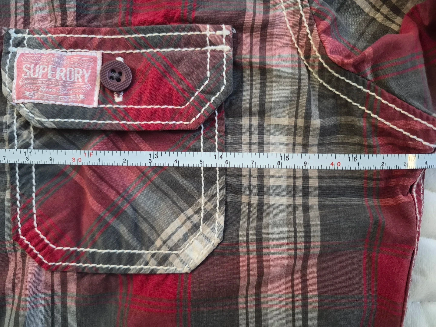 This is a Superdry long sleeve plaid shirt. It features two chest pockets with button closures. The shirt is made of a cotton blend for comfort. It's perfect for casual wear.