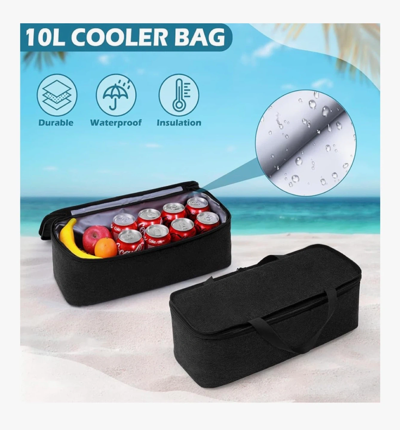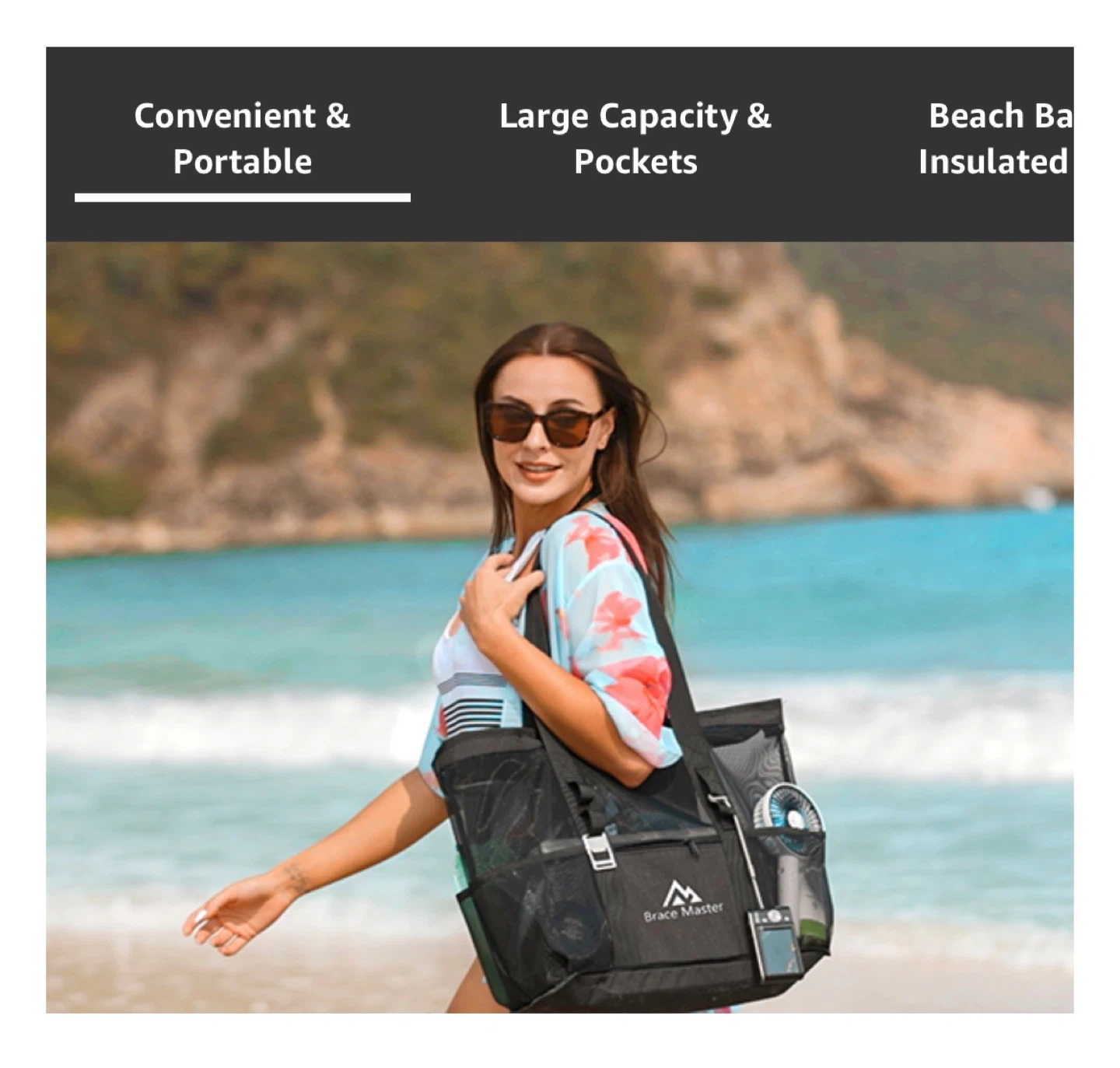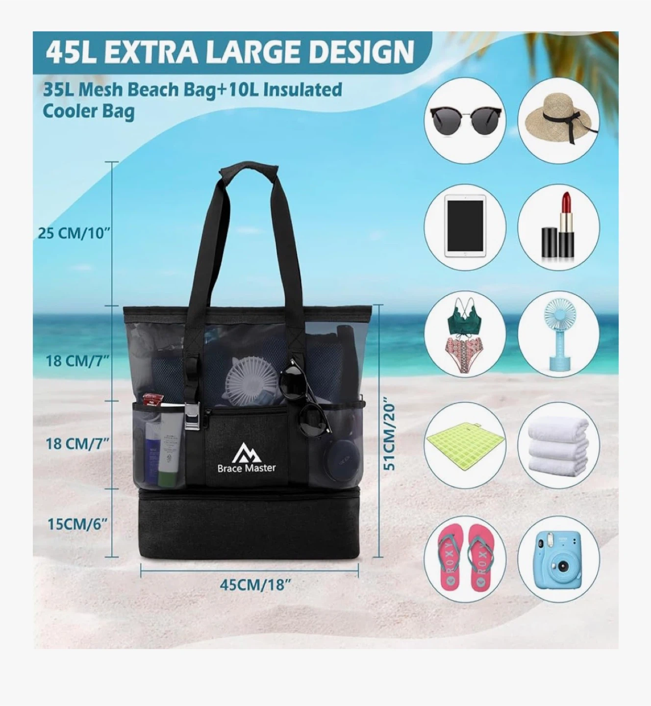 This is a 45L Brace Master beach tote bag with a 35L mesh bag and a 10L detachable insulated cooler. It's made of durable nylon and PVC material and features 6 pockets for easy storage. The waterproof liner in the cooler keeps your food and drinks fresh.