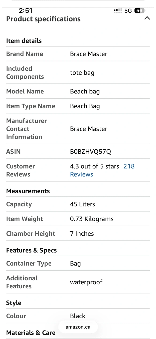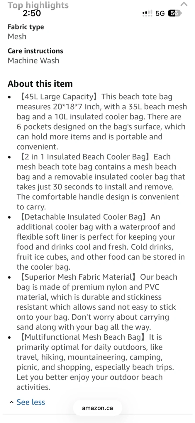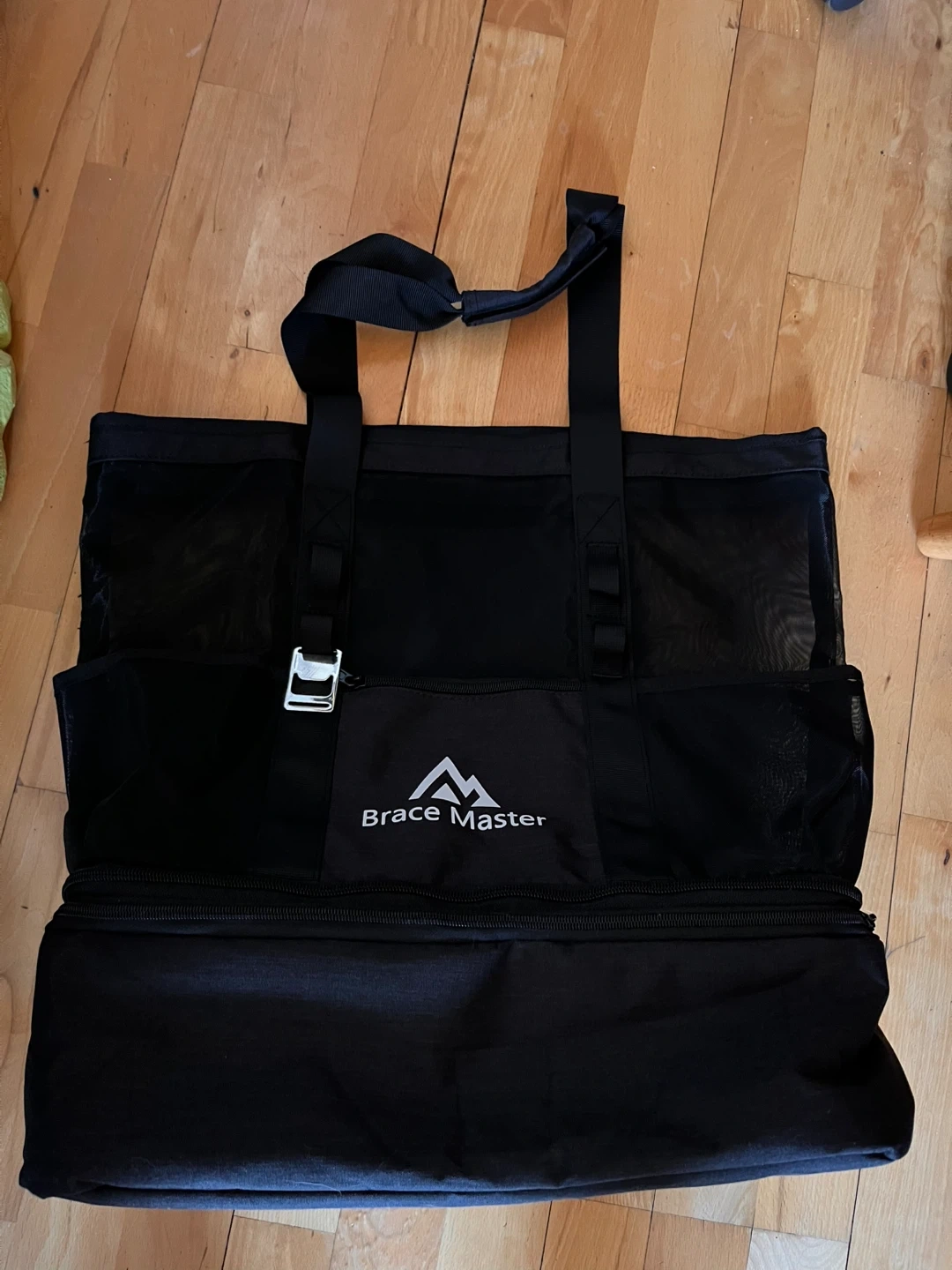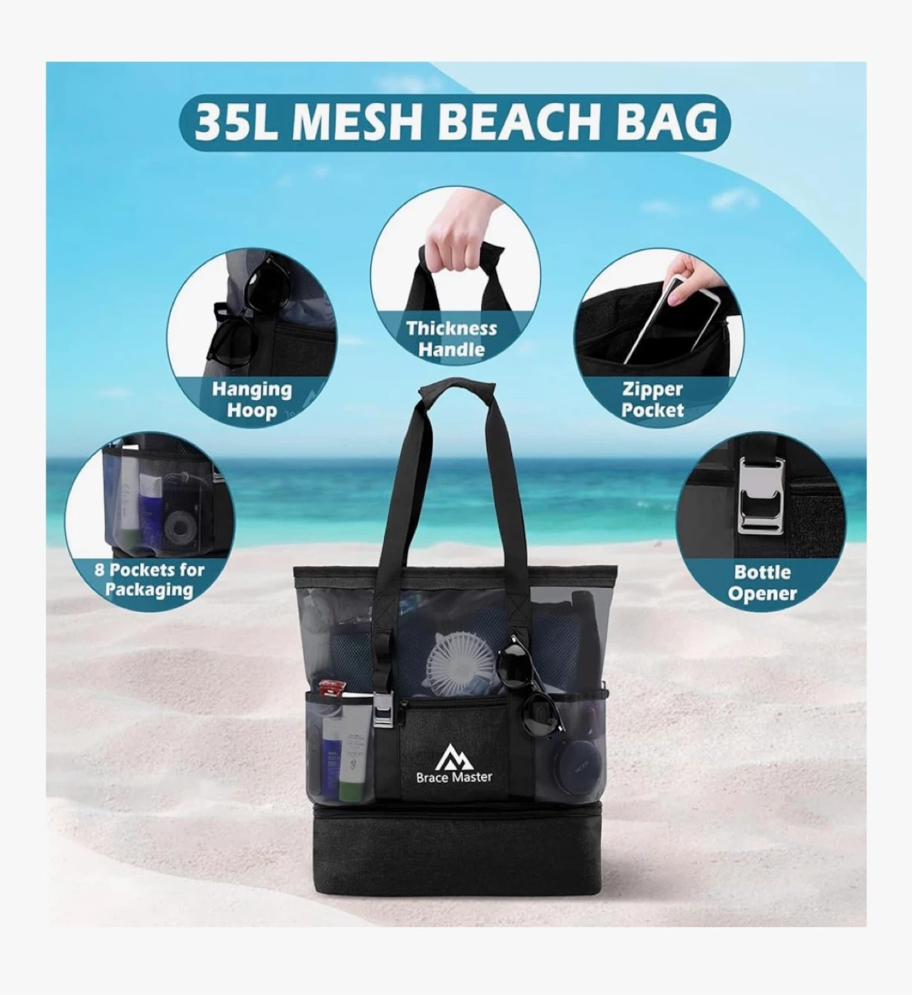 This is a 45L Brace Master beach tote bag with a 35L mesh bag and a 10L detachable insulated cooler. It's made of durable nylon and PVC material and features 6 pockets for easy storage. The waterproof liner in the cooler keeps your food and drinks fresh.