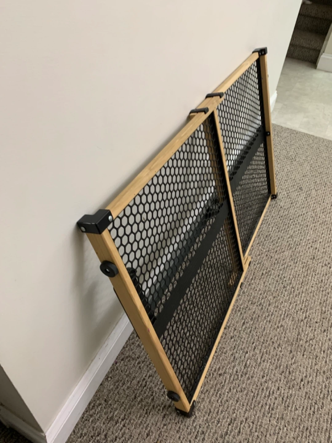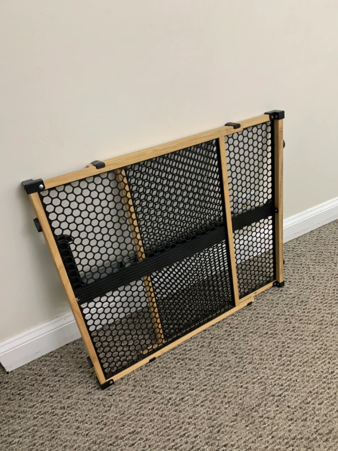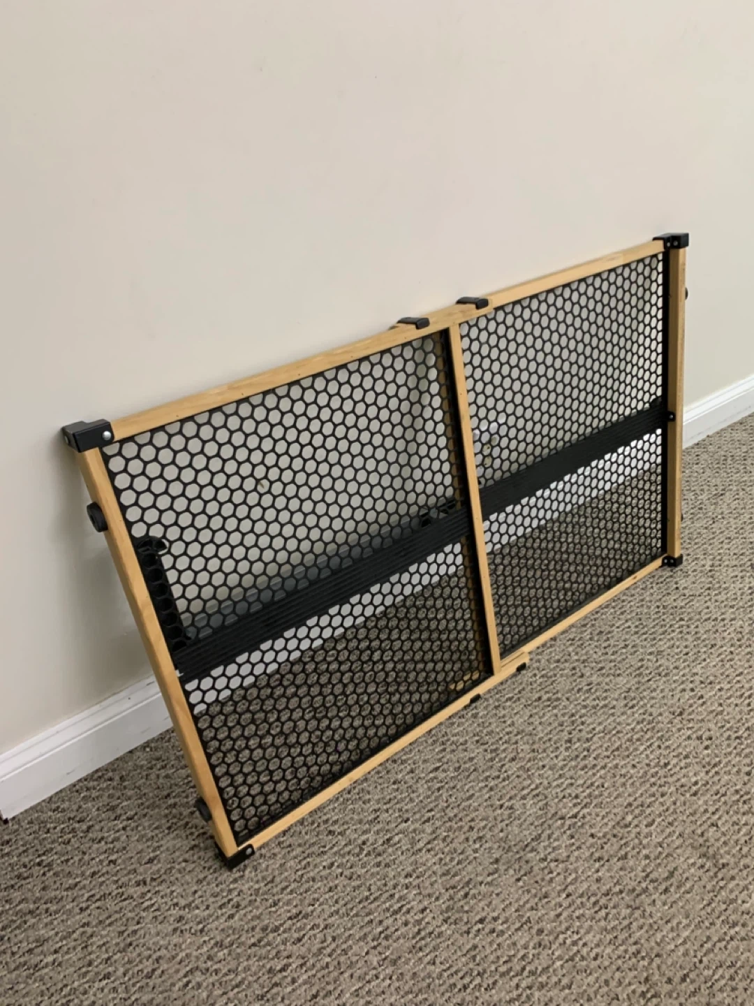 This is a wooden and metal baby gate or pet gate. It features a foldable design for easy storage. The mesh provides good ventilation.