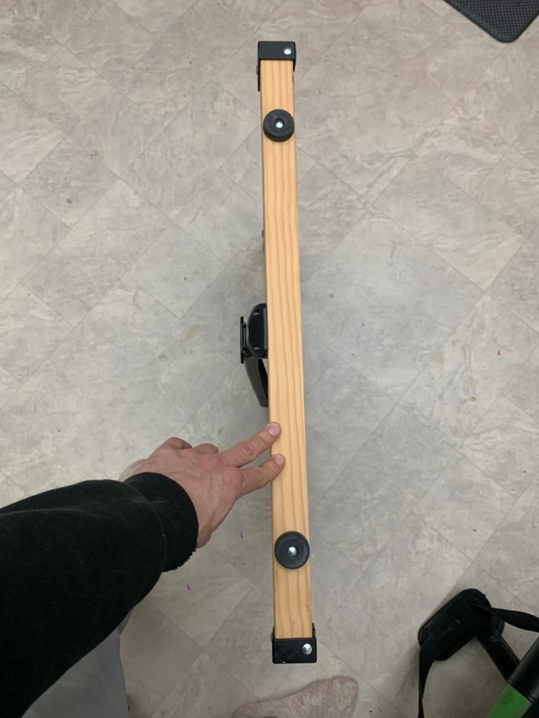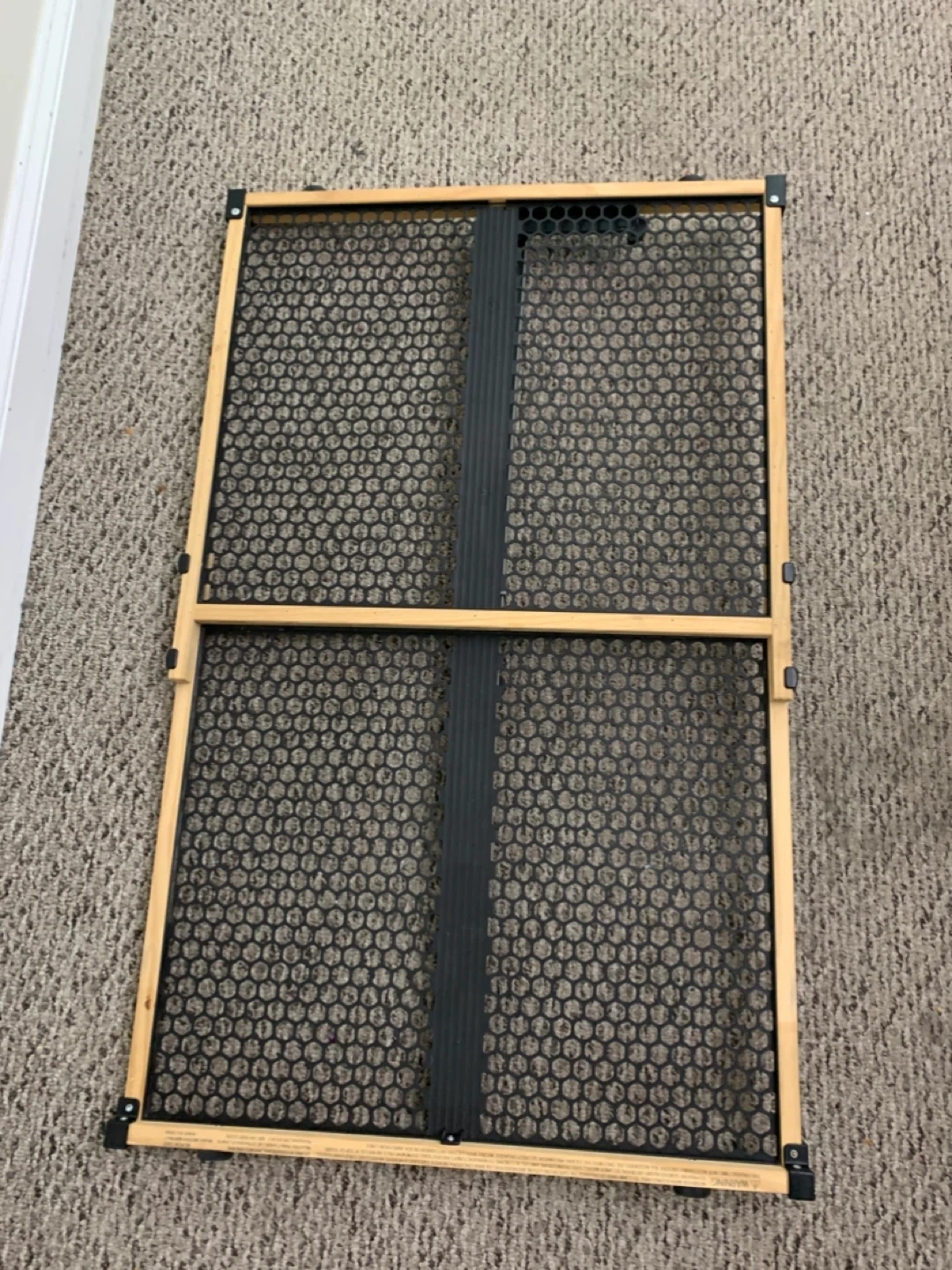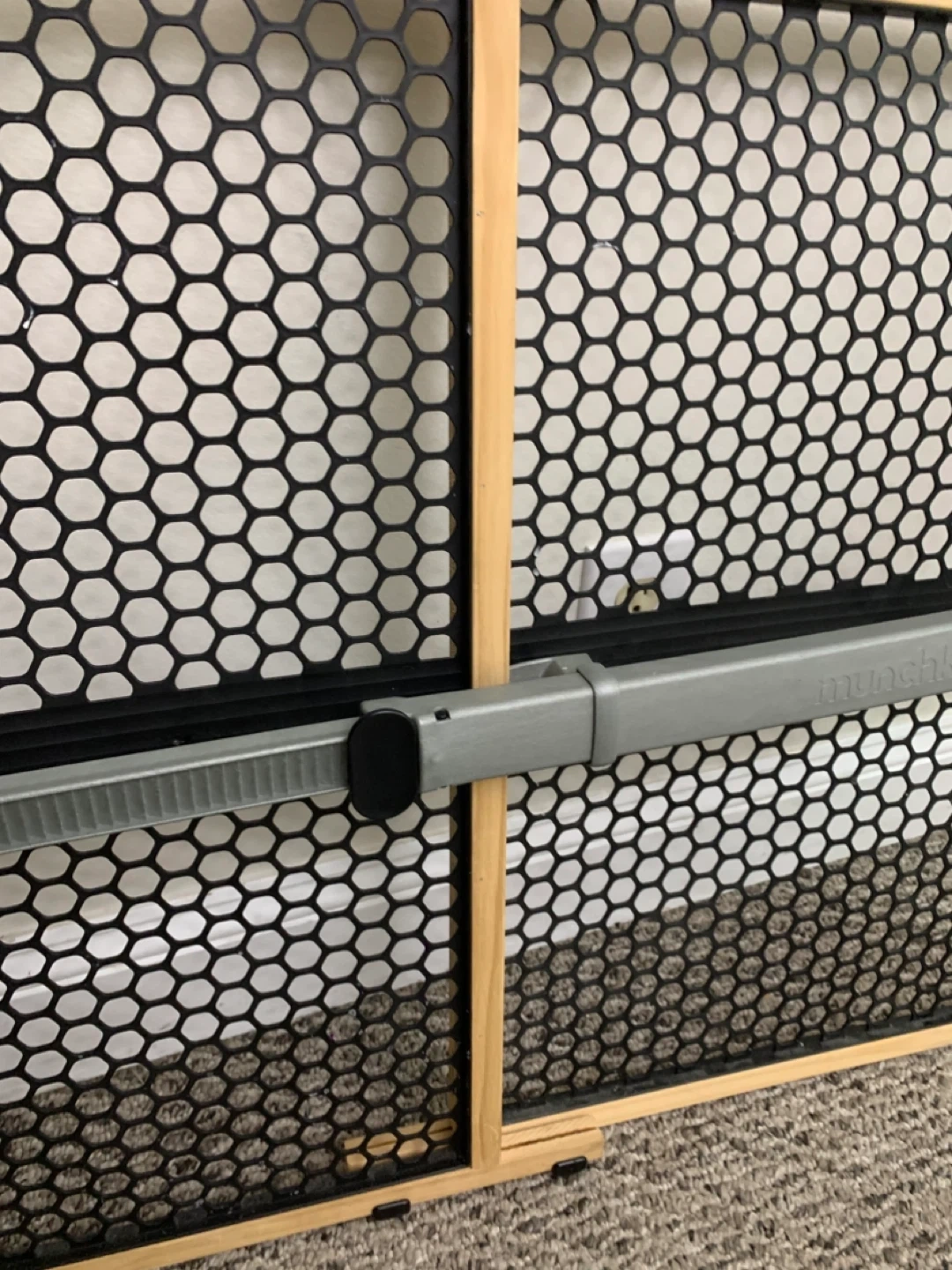 This is a wooden and metal baby gate or pet gate. It features a foldable design for easy storage. The mesh provides good ventilation.