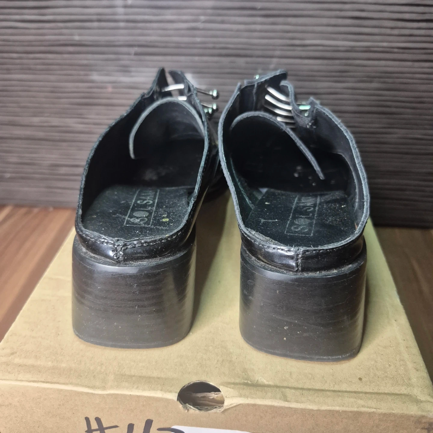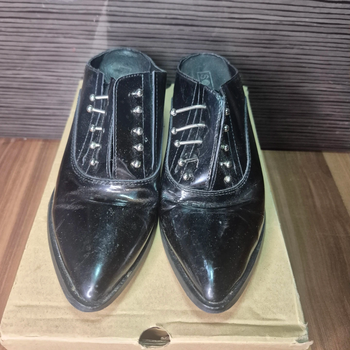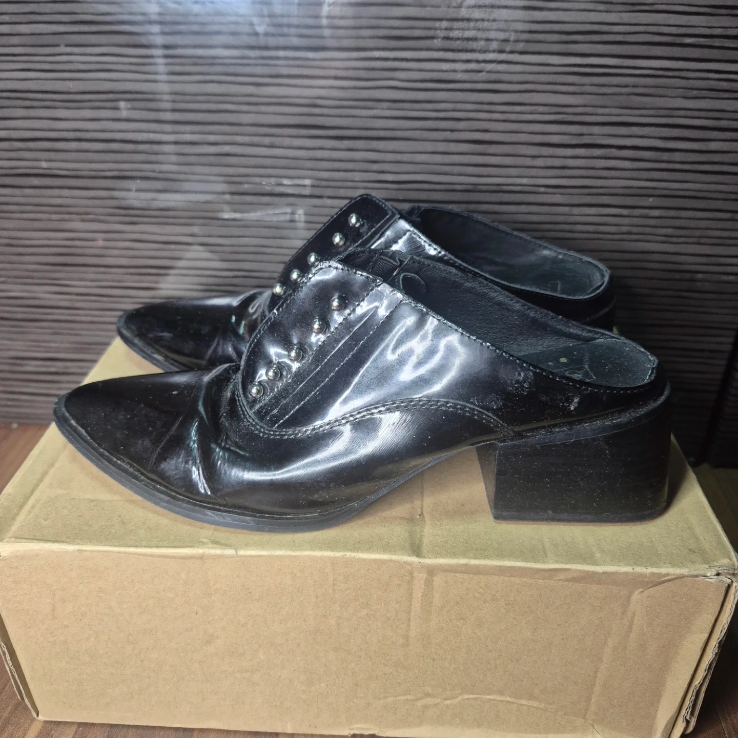 Stylish black patent leather mules with a pointed toe and decorative silver studs. These slip-on shoes have a block heel, making them comfy for everyday wear. They're made of patent material.