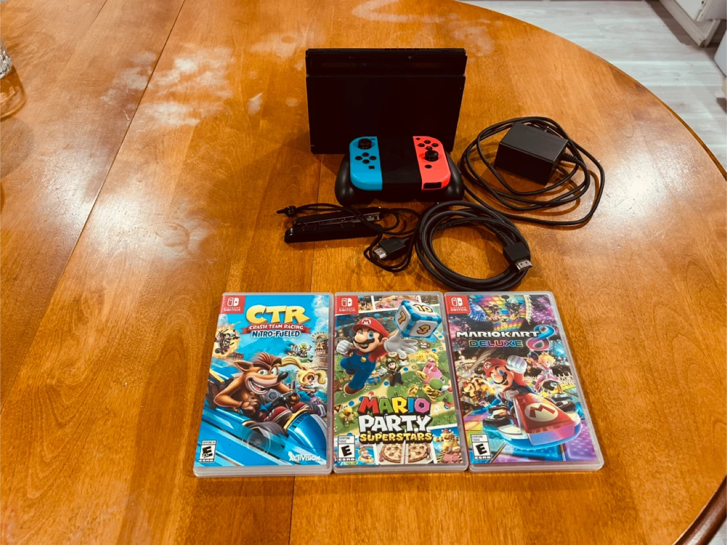Nintendo Switch console bundle. Comes with three games: Crash Team Racing Nitro-Fueled, Mario Party Superstars, and Mario Kart 8 Deluxe. Includes necessary cables and controllers.