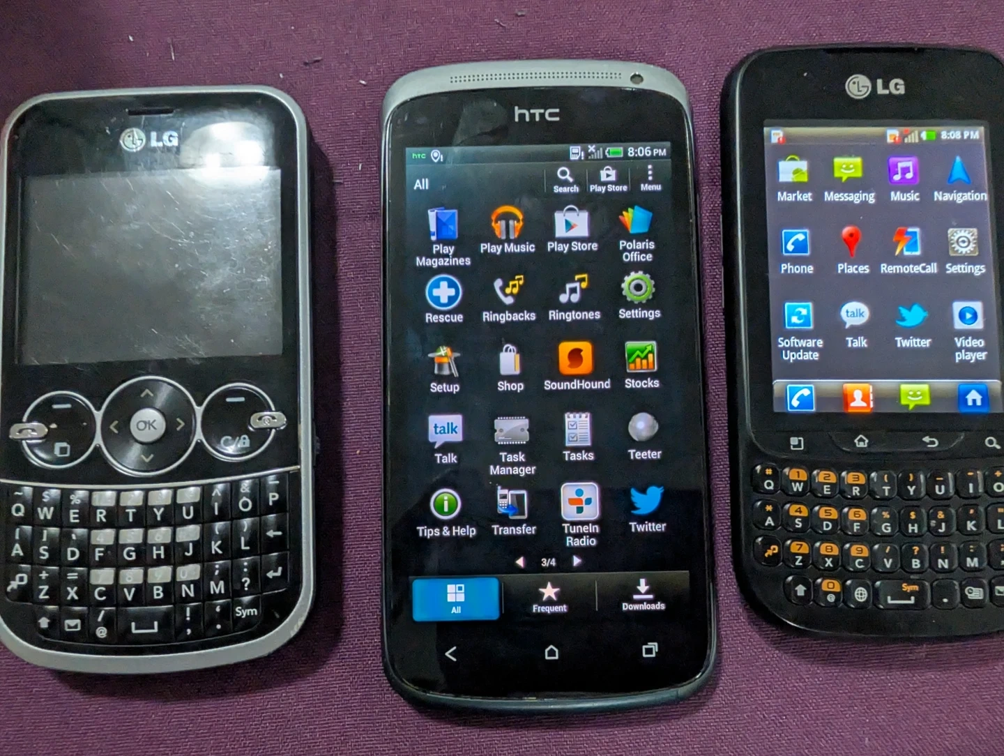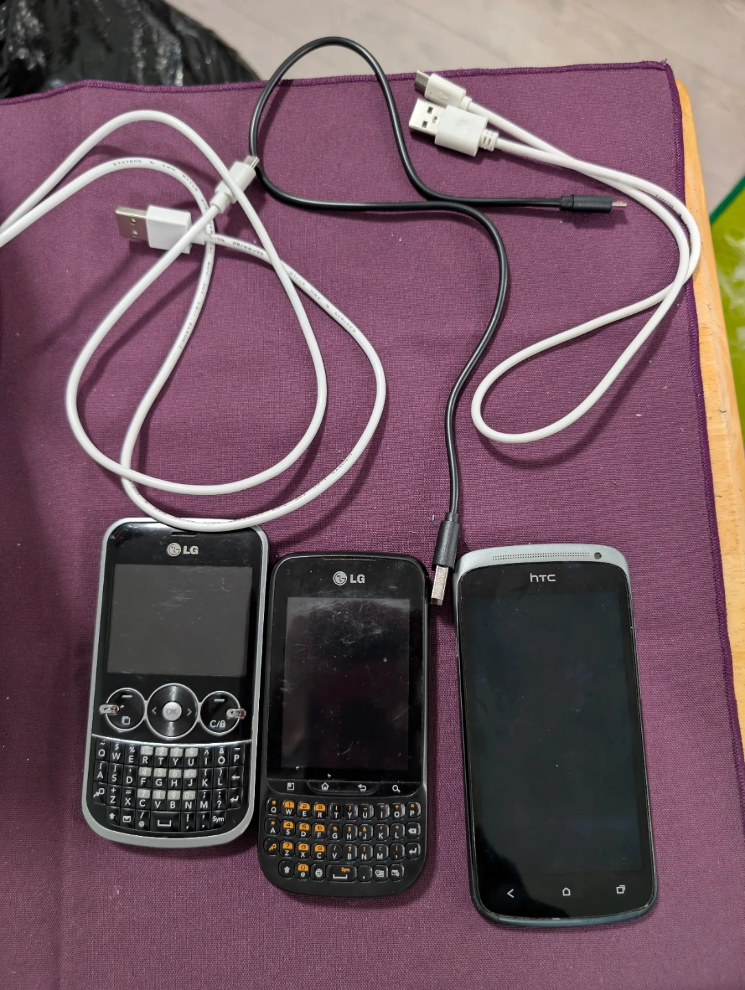 Bundle includes two LG phones with full QWERTY keyboards and one HTC smartphone. Includes charging cables. "Selling a working collection of mobile history. All three phones have been tested, factory reset, and come with their own charging cables.