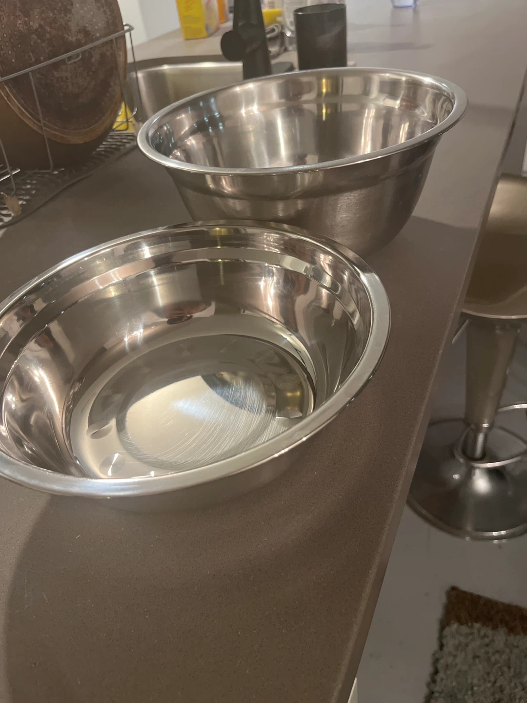 Two stainless steel mixing bowls. They're good for preparing ingredients for cooking or baking. Stainless steel material.