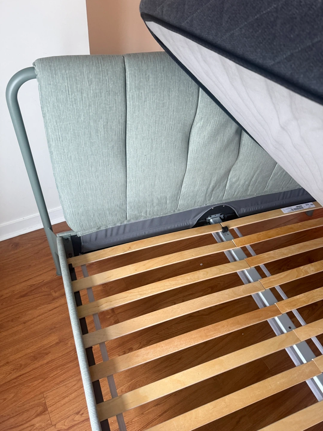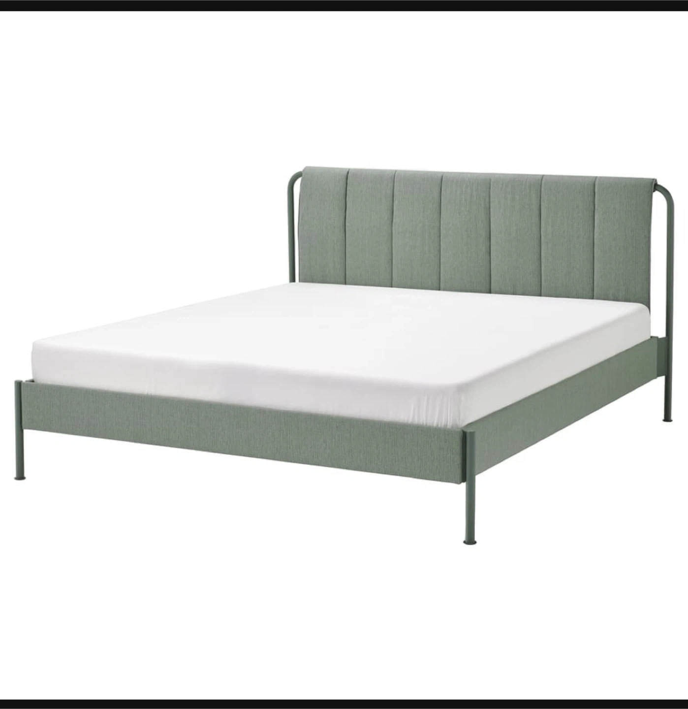 This is an IKEA TALLASEN bed frame in a lovely green colour. It's a sturdy metal frame with a fabric headboard. Slatted base included.