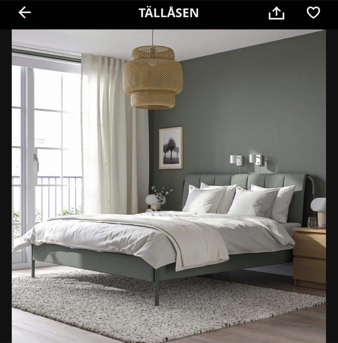 This is an IKEA TALLASEN bed frame in a lovely green colour. It's a sturdy metal frame with a fabric headboard. Slatted base included.