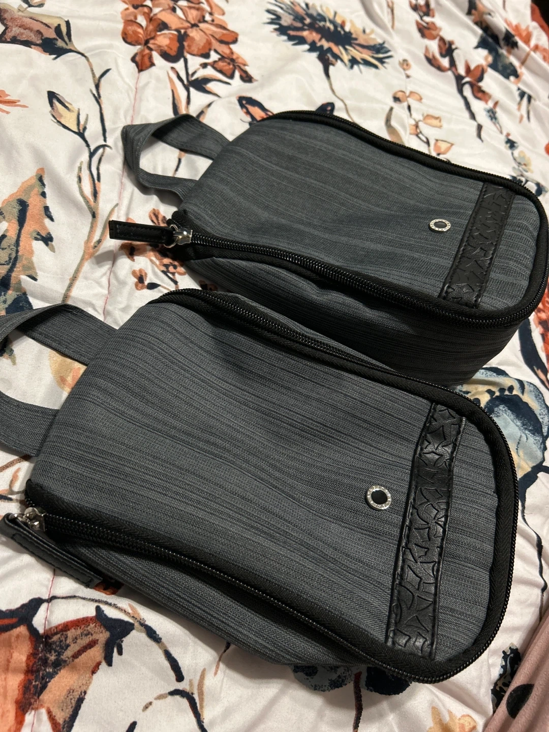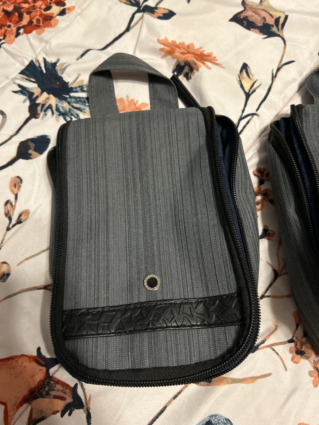 Two Bvlgari travel toiletry bags, Each bag features a hook for hanging and multiple interior pockets. Perfect for travel or organizing your essentials! The Versace Eros is empty , just making the idea, the bags are new!