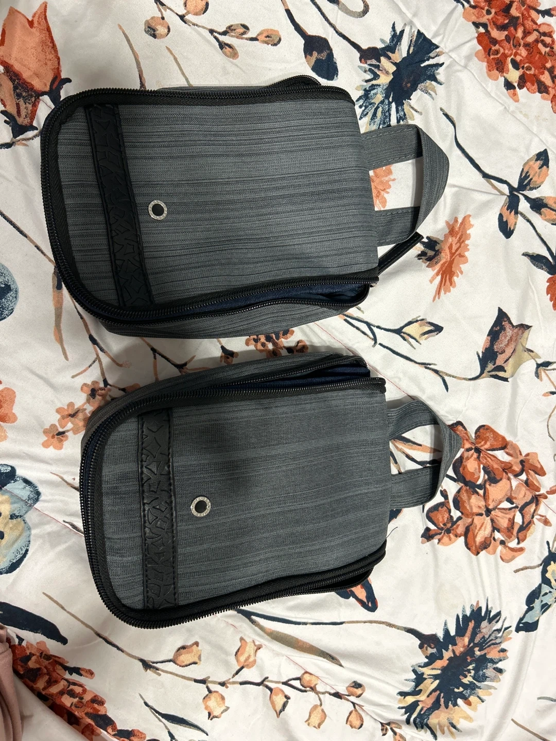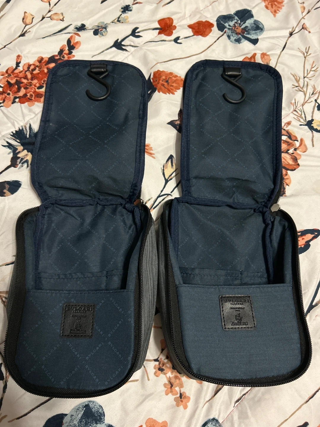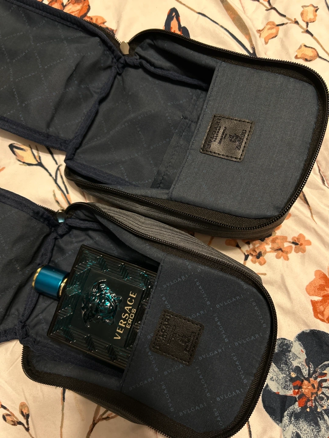 Two Bvlgari travel toiletry bags, Each bag features a hook for hanging and multiple interior pockets. Perfect for travel or organizing your essentials! The Versace Eros is empty , just making the idea, the bags are new!