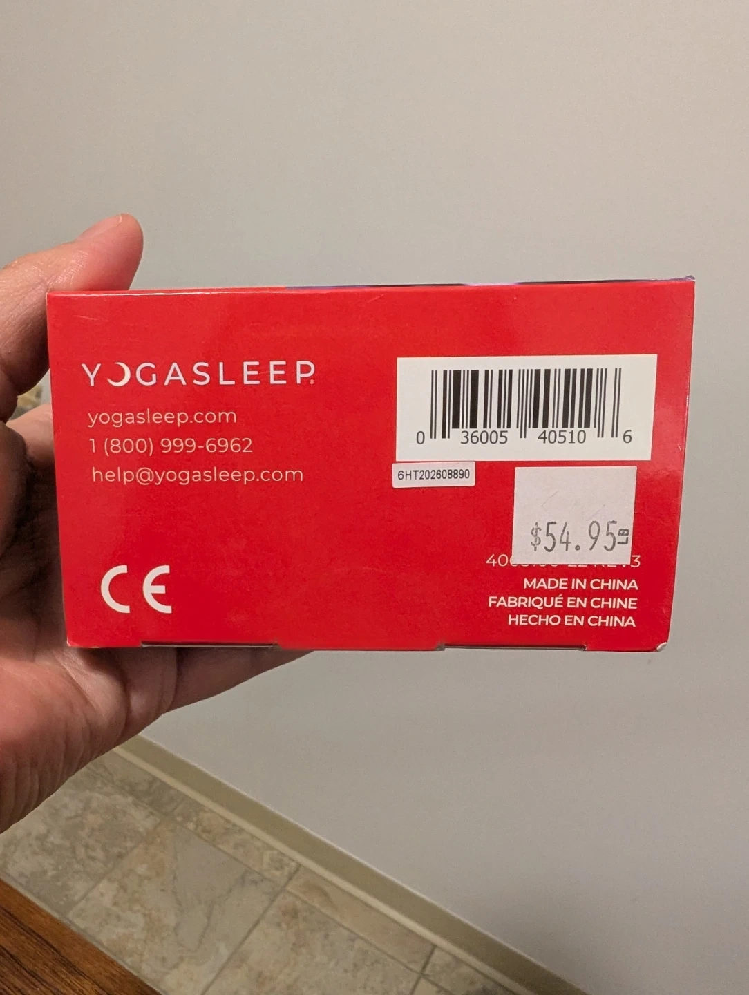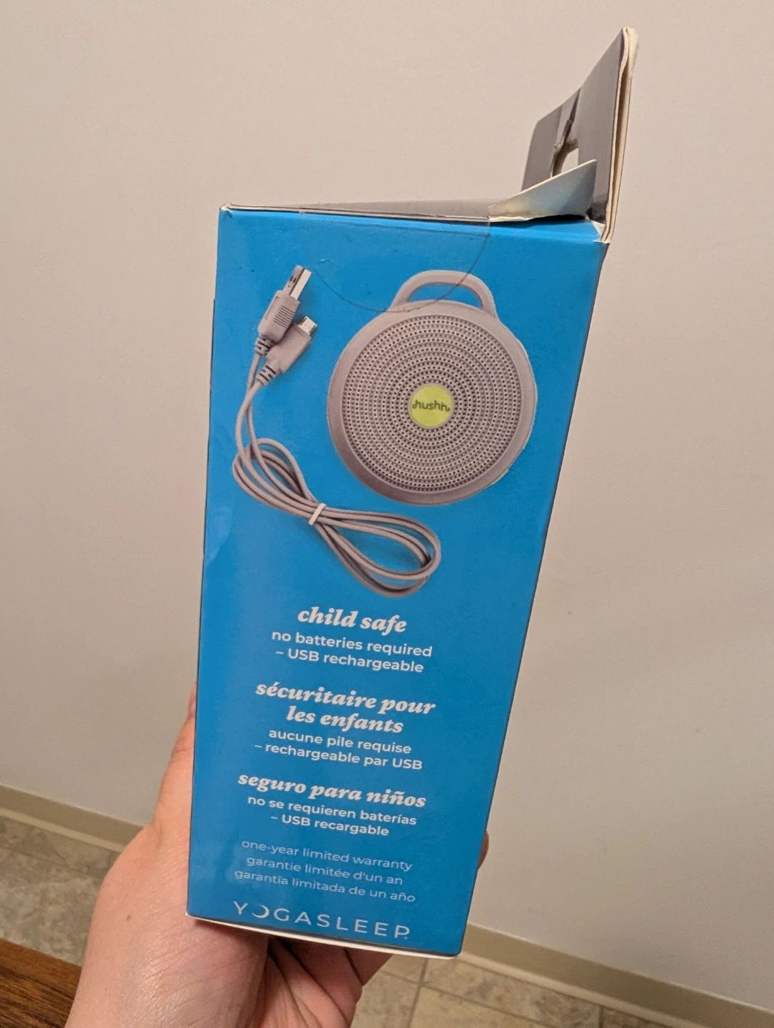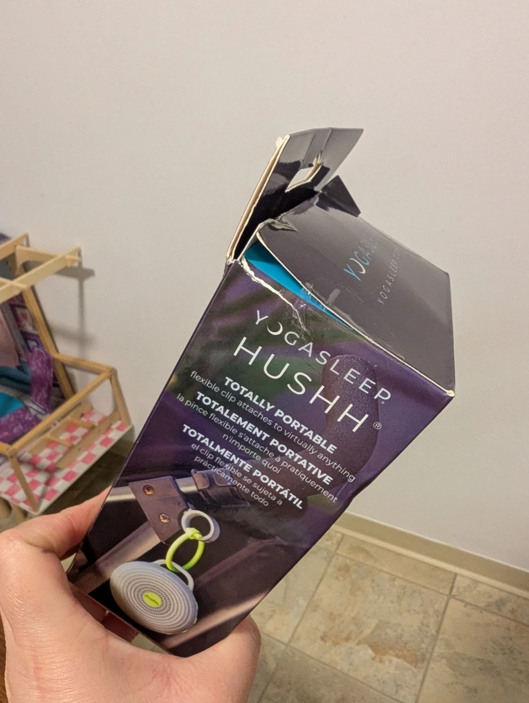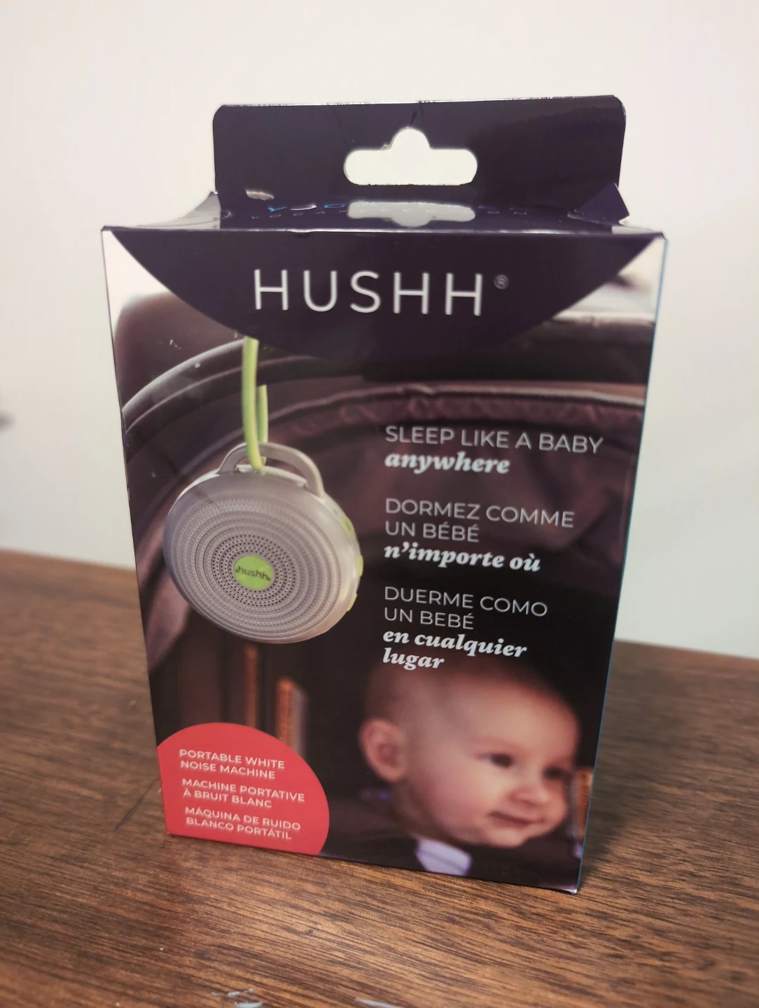 Yogasleep Hushh portable white noise machine. Totally portable flexible clip attaches to virtually anything. No batteries required, USB rechargeable. Includes original box.