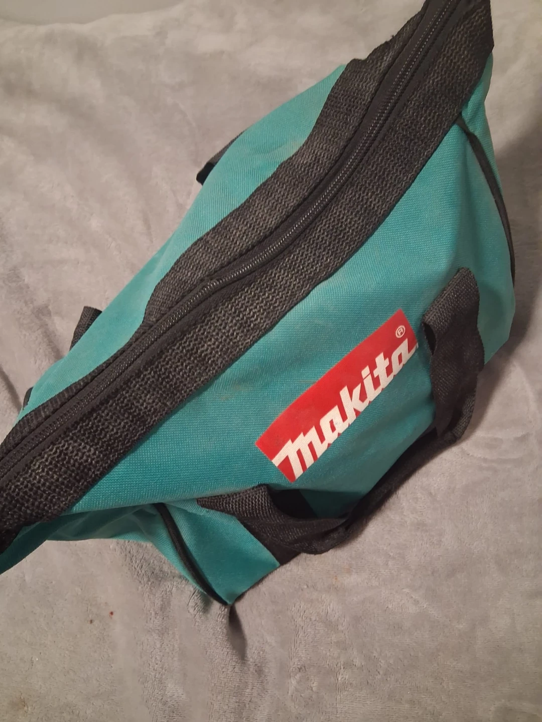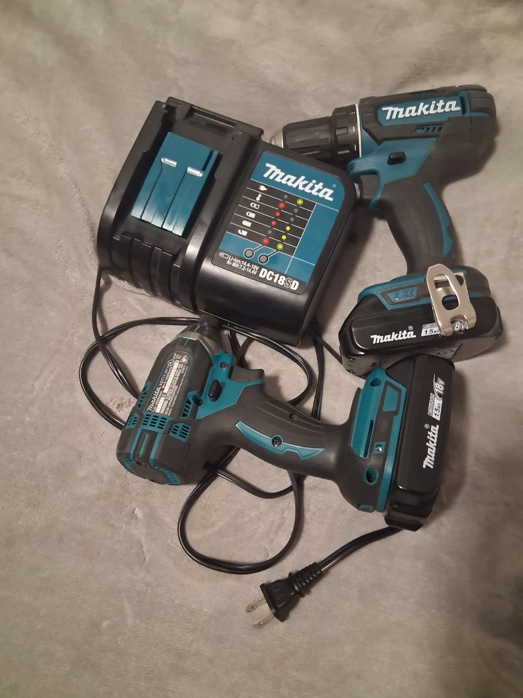 This Makita cordless drill and impact driver combo kit includes a DC18SD charger and two 1.5Ah 18V batteries. It also comes with a teal and gray Makita tool bag. This set is ready for your projects!