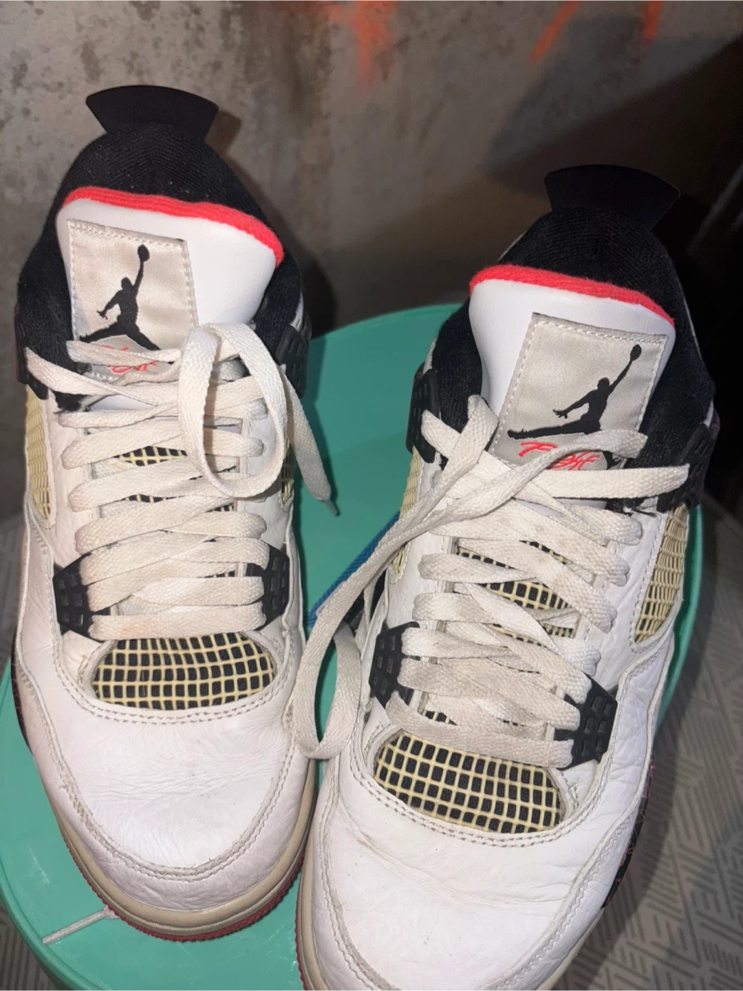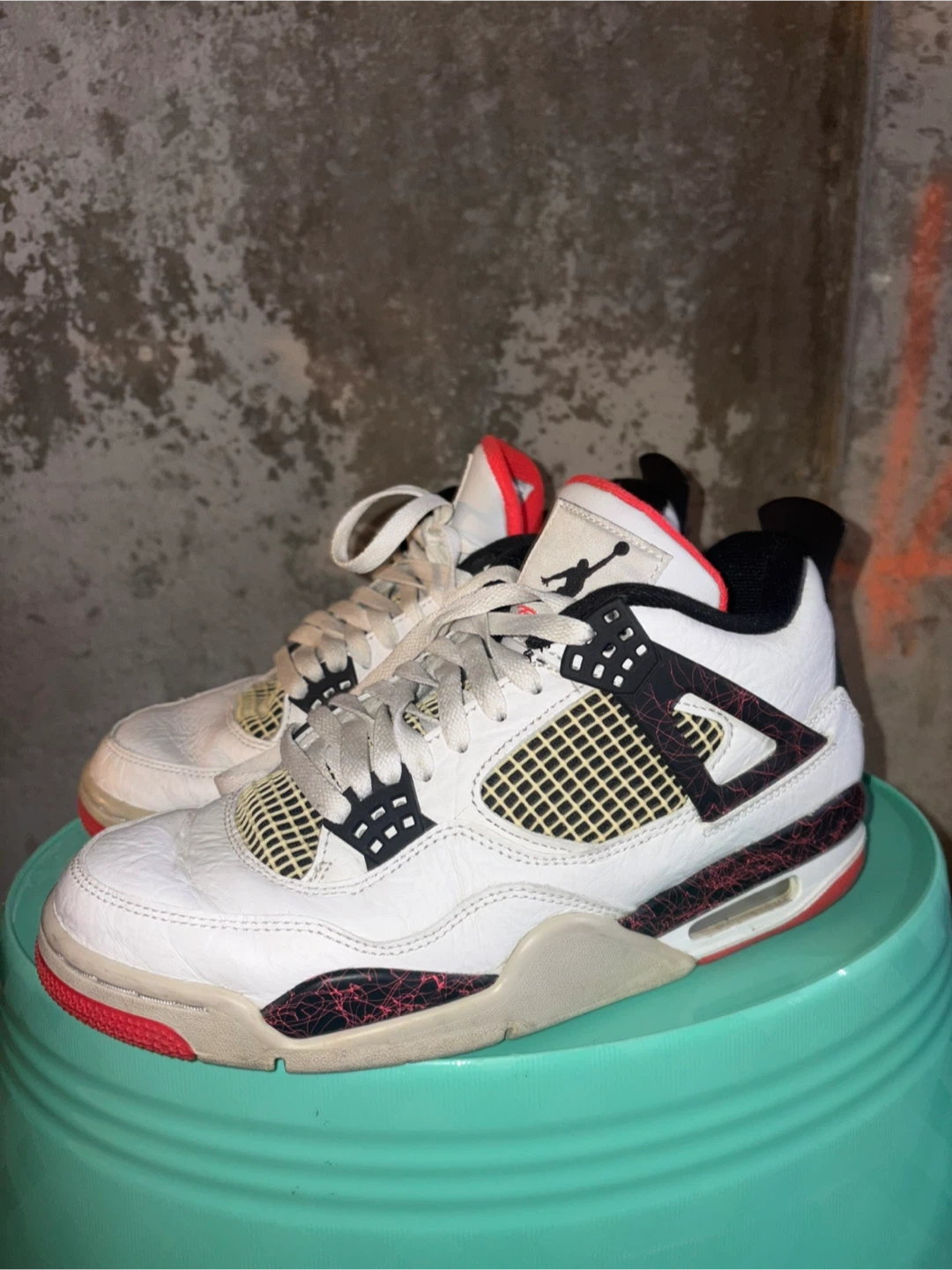 These are white Air Jordan 4 Retro sneakers with red and black accents. They're made of leather and feature a rubber sole. Size is 8.5 US, 7.5 UK, 42 EUR, 26.5 CM.