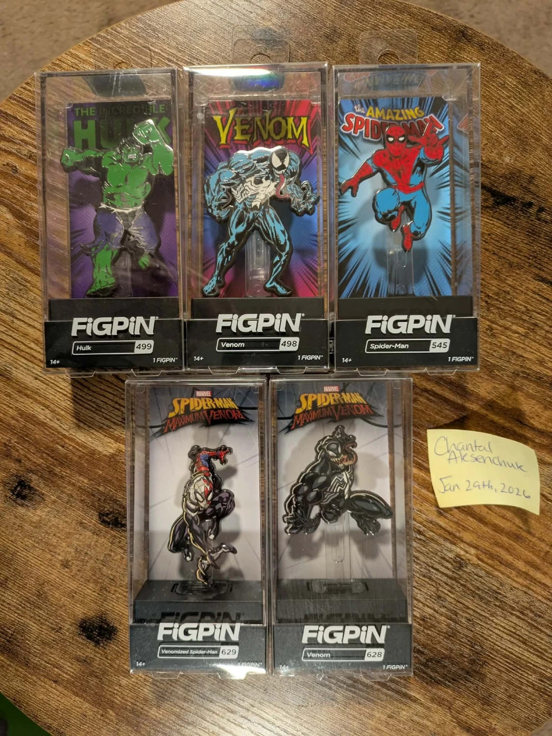 Set of five collectible FIGPINs featuring Marvel characters including Hulk, Venom, Spider-Man, and two Venomized Spider-Man versions. Each pin is in its original display case. These are high-quality enamel pins.
