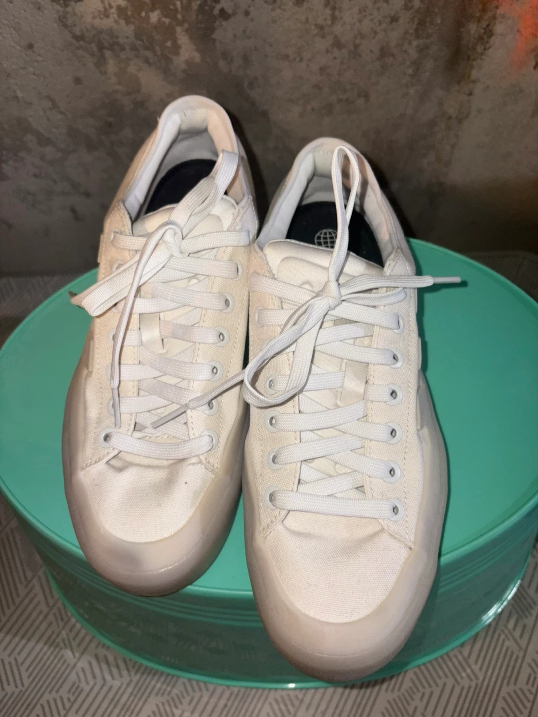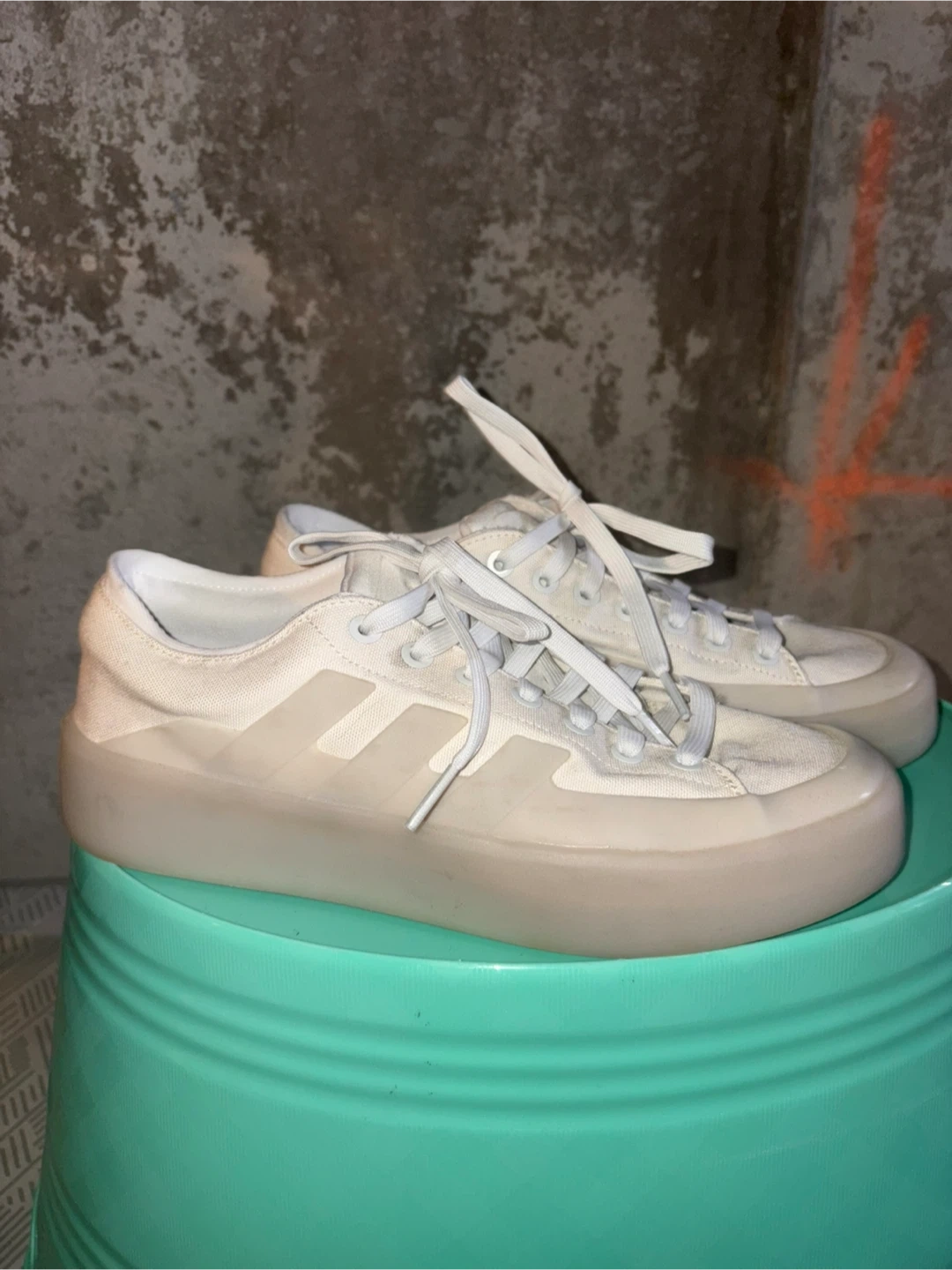White canvas Adidas sneakers with a translucent platform sole. These shoes are a women's size 8 UK / 7.5 US. They feature a lace-up closure and are made for everyday wear.