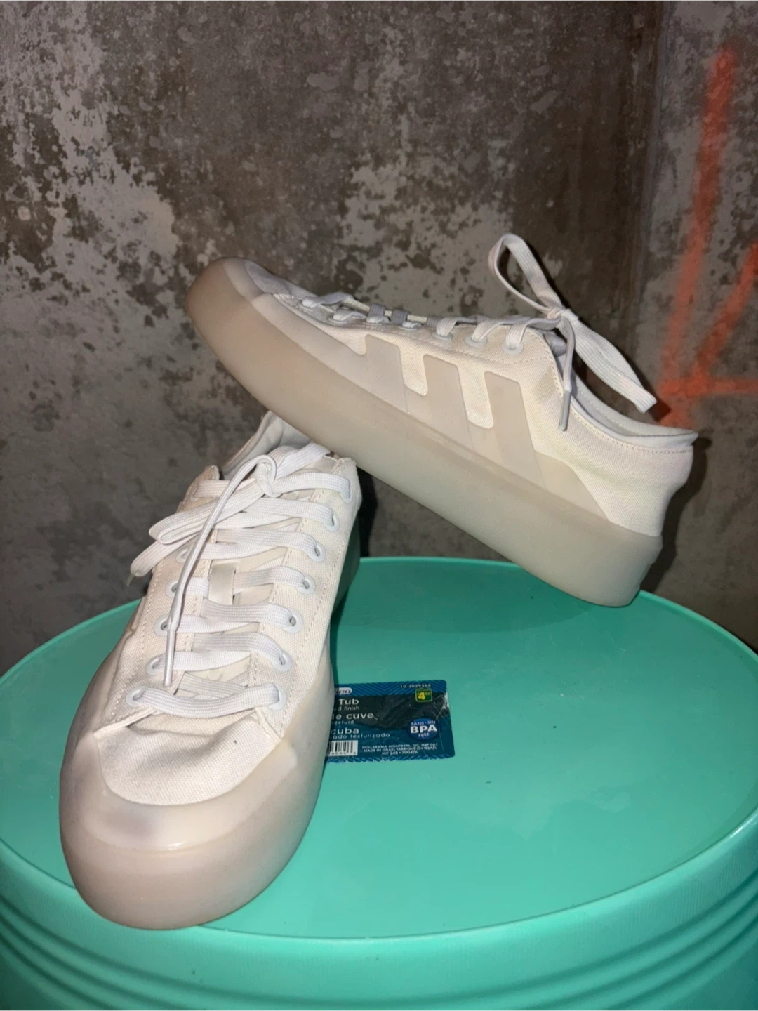 White canvas Adidas sneakers with a translucent platform sole. These shoes are a women's size 8 UK / 7.5 US. They feature a lace-up closure and are made for everyday wear.