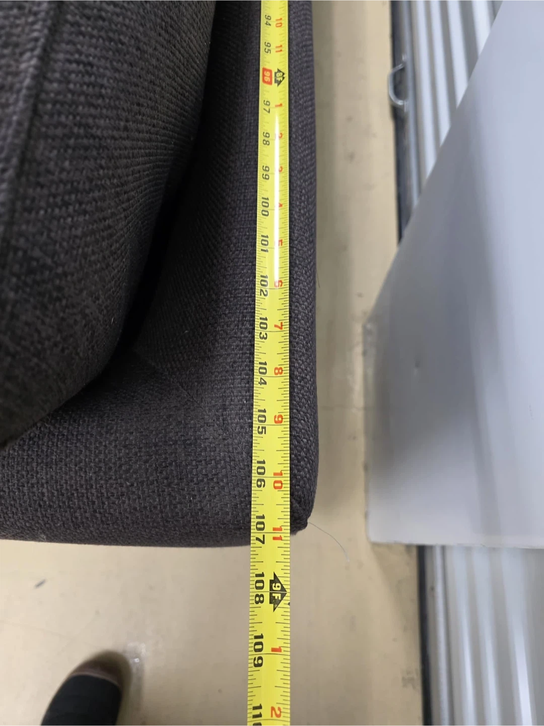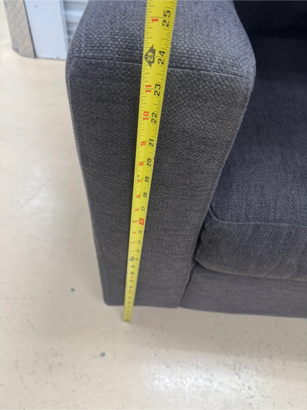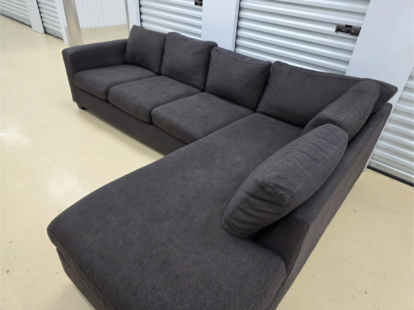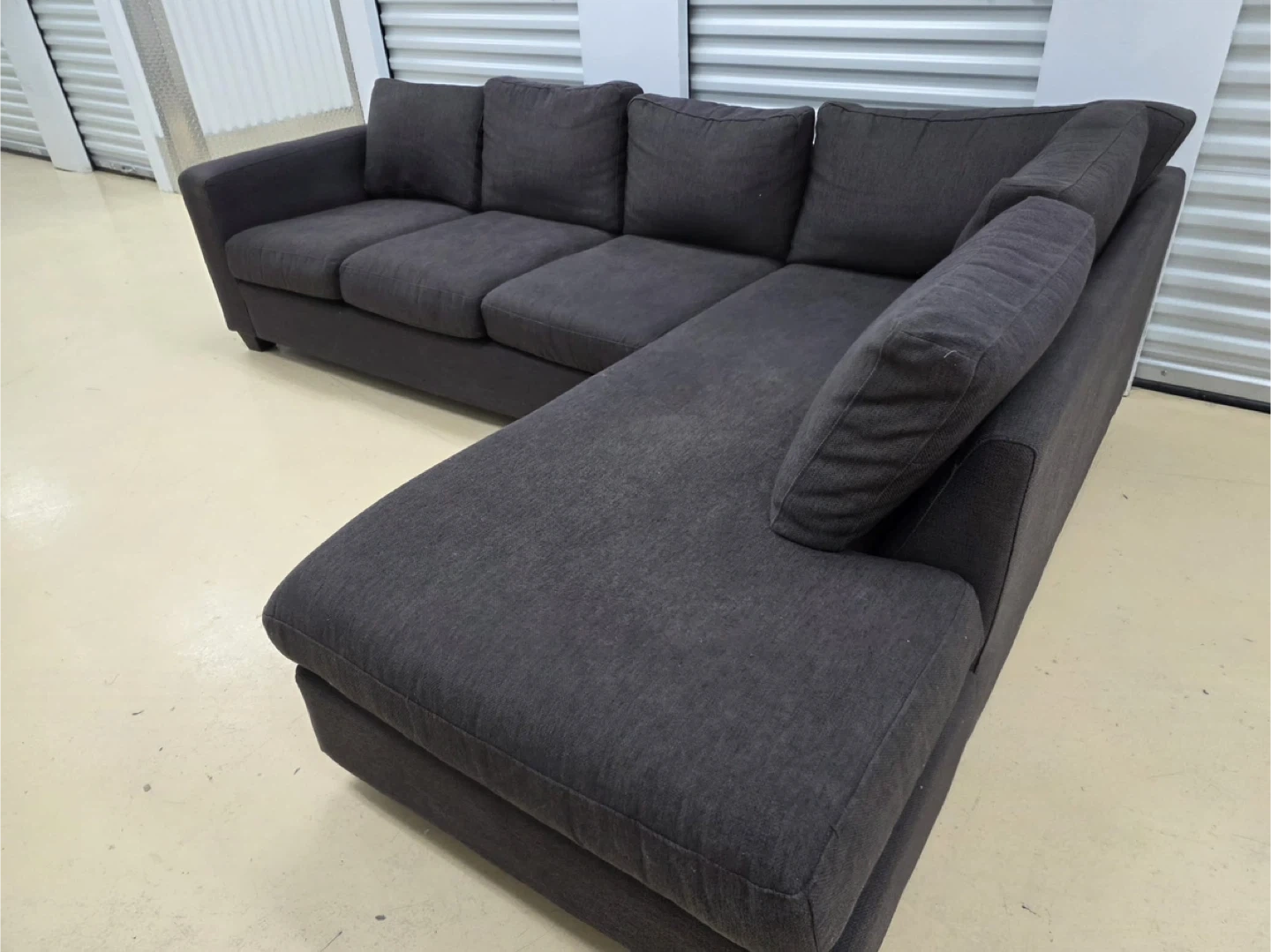 A dark grey sectional sofa with a chaise. It's upholstered in a textured fabric. Includes multiple toss cushions. Home delivery available