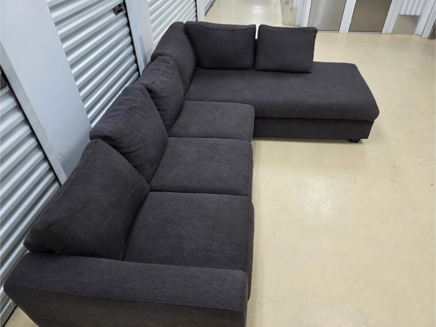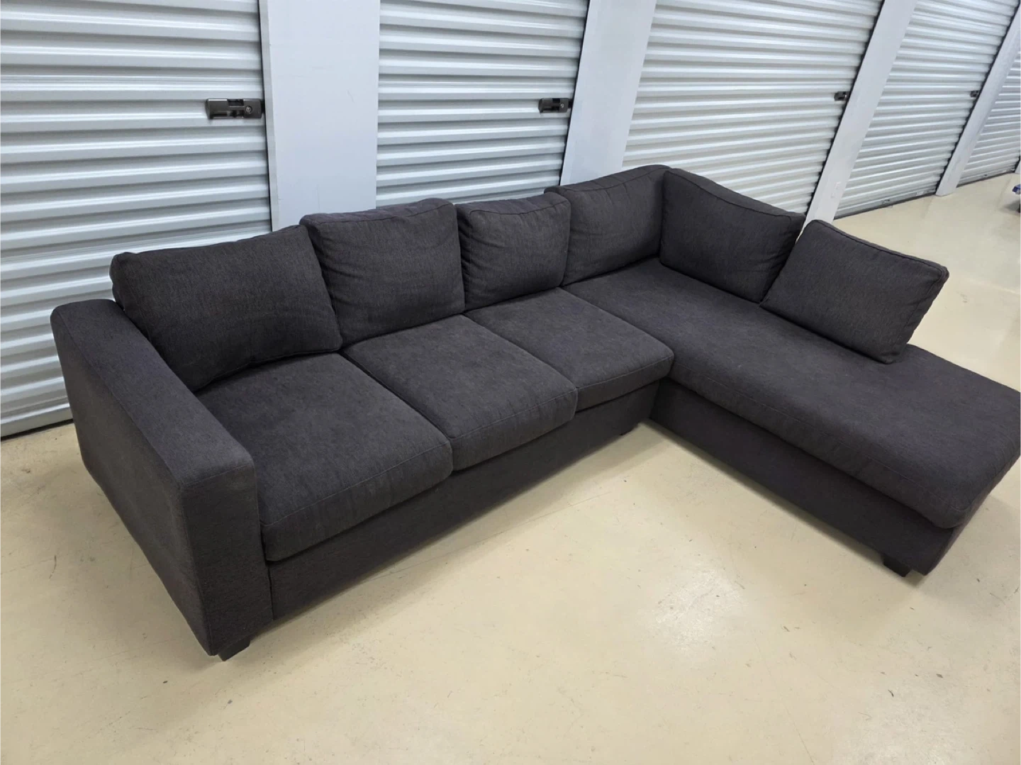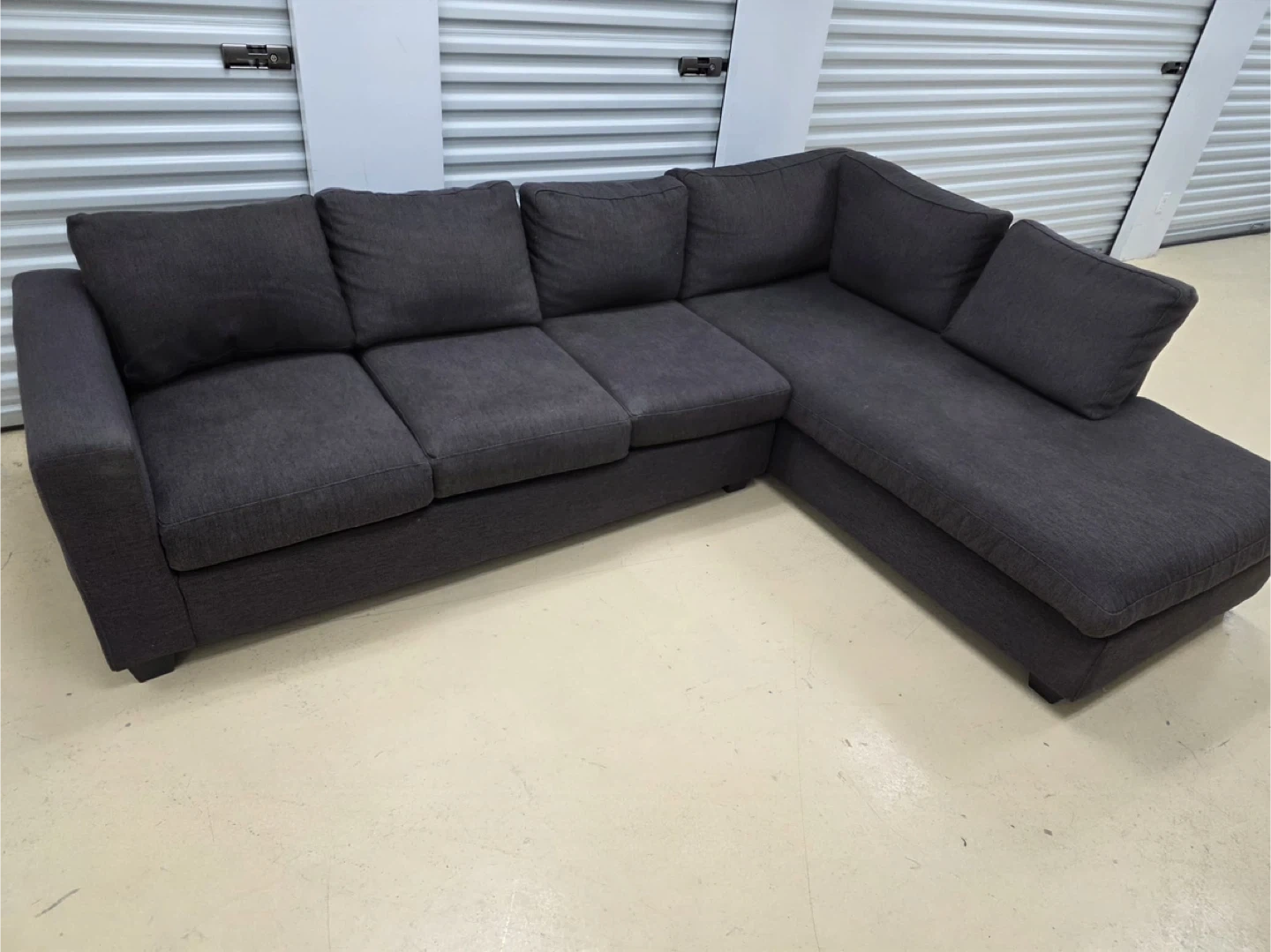 A dark grey sectional sofa with a chaise. It's upholstered in a textured fabric. Includes multiple toss cushions. Home delivery available