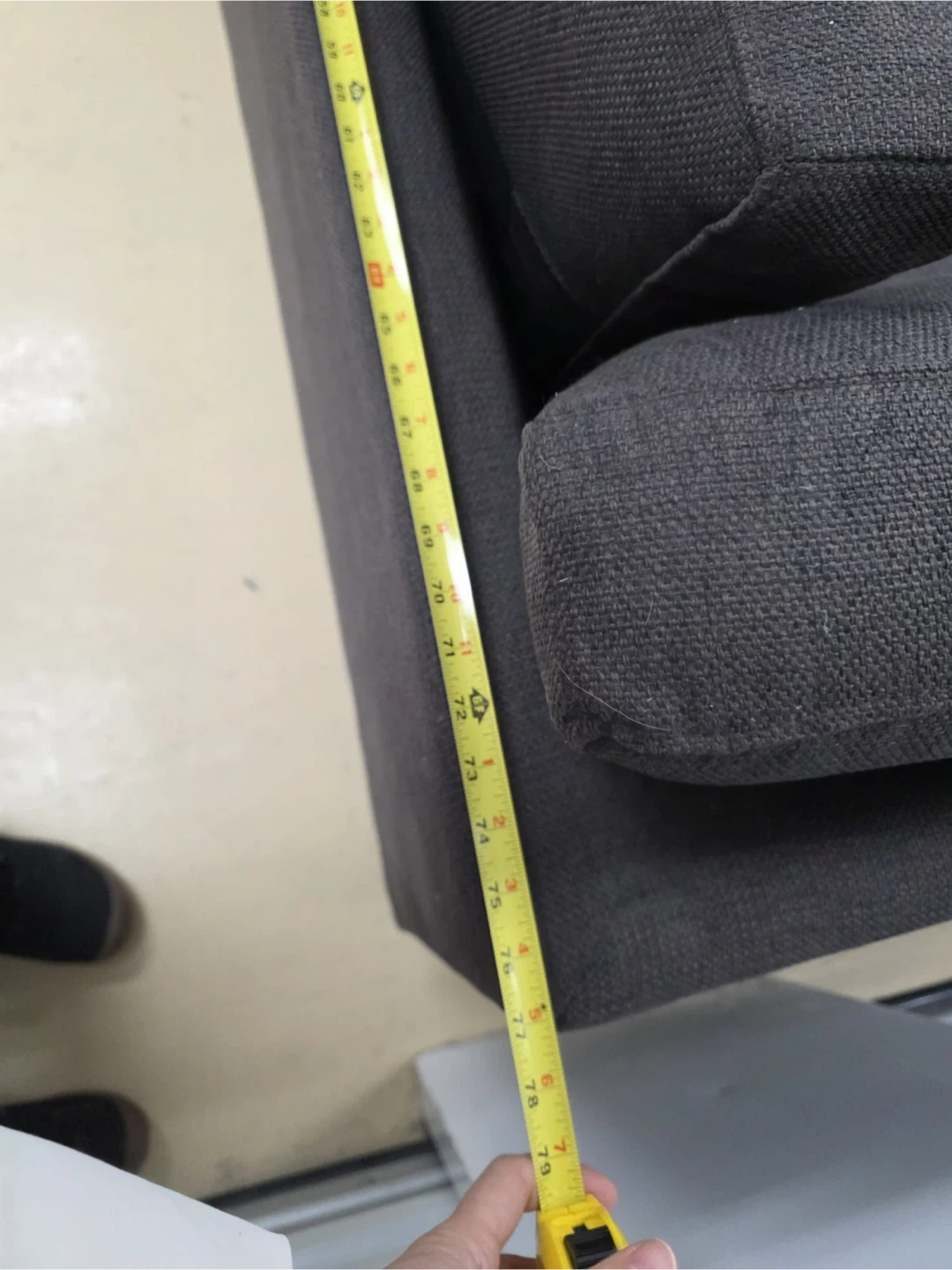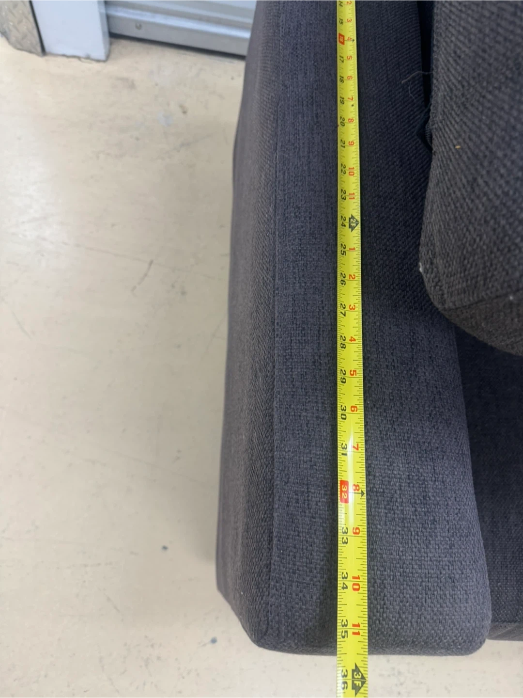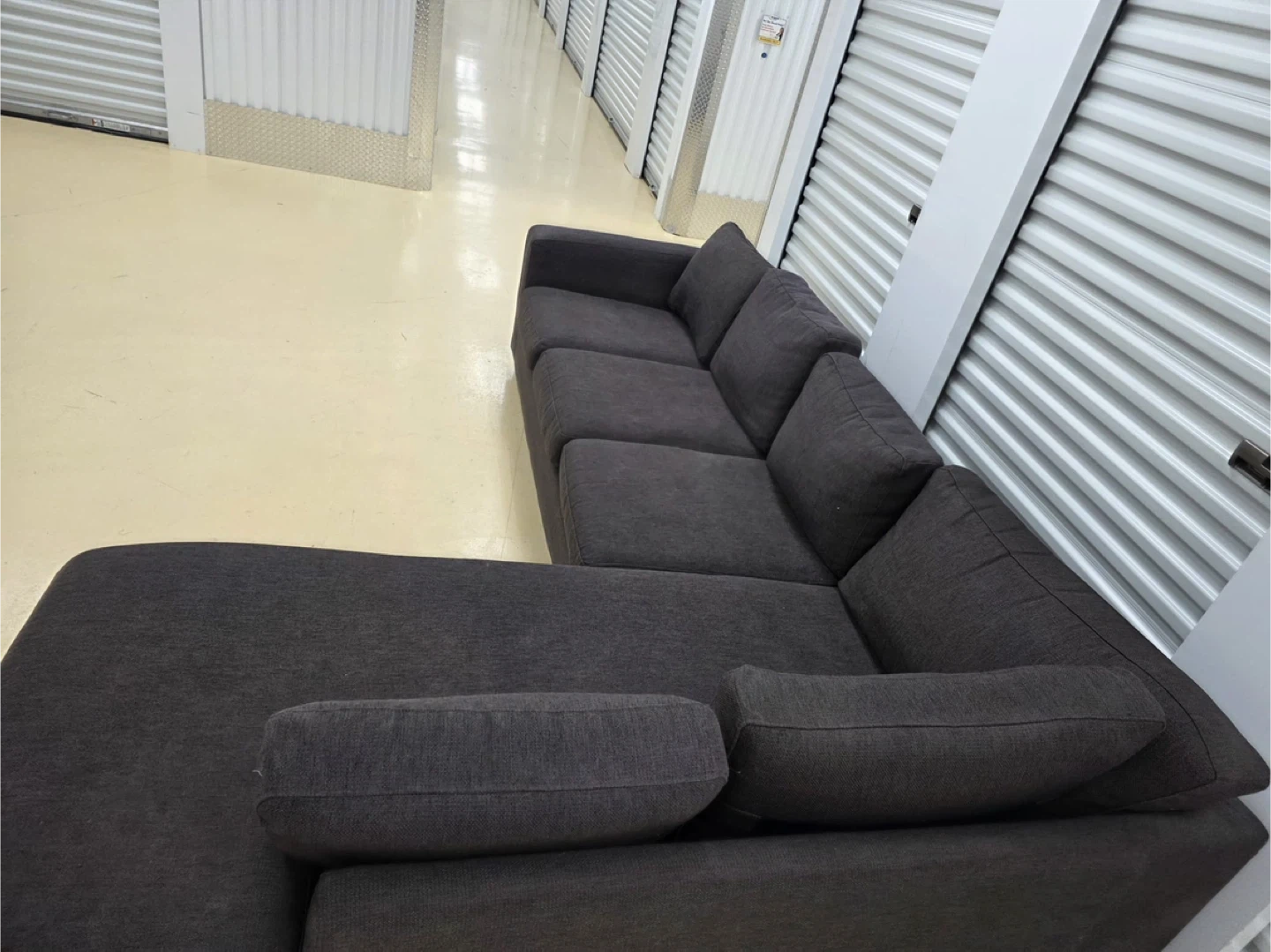 A dark grey sectional sofa with a chaise. It's upholstered in a textured fabric. Includes multiple toss cushions. Home delivery available