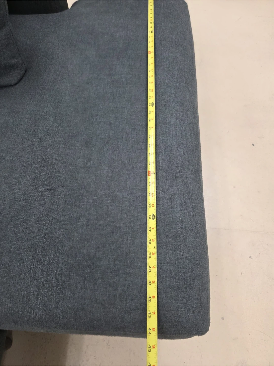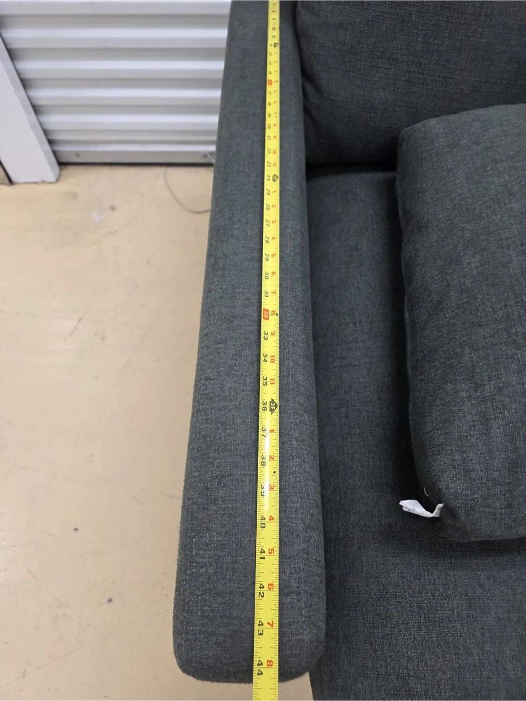 This is a dark grey sectional sofa with plush cushions. It's upholstered in a durable fabric. The sofa's arm height is approximately 25 inches.home delivery available