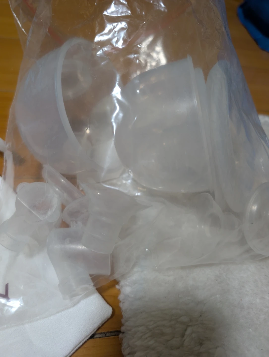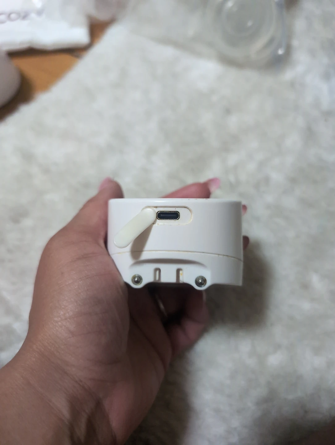 This set includes wearable breast pump parts and two white Momcozy motors. It's great for pumping on the go. The motors have a USB-C charging port.