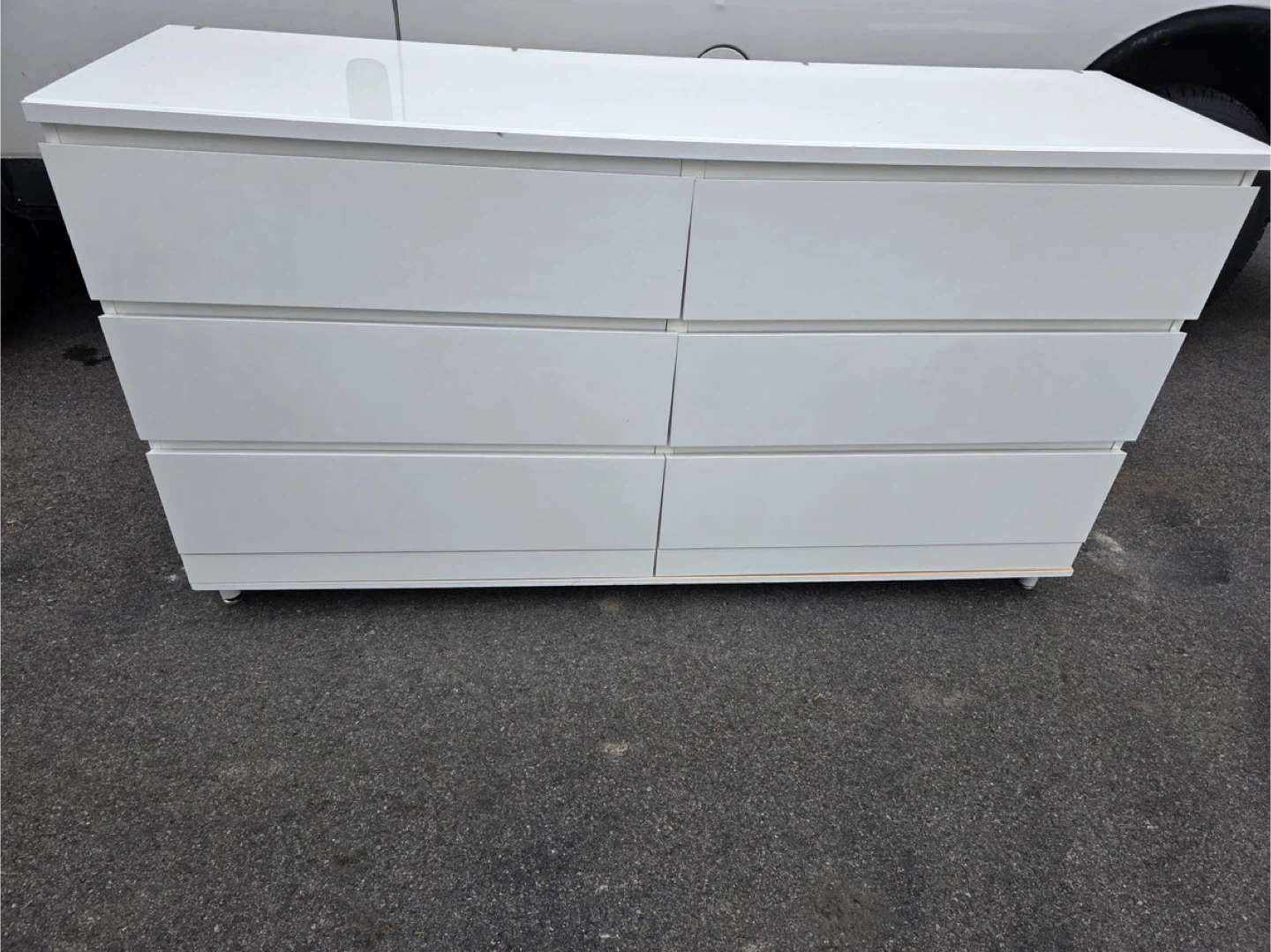 White 6-drawer dresser, perfect for organizing clothes or linens. It's got a clean, modern look and offers plenty of storage space. Dimensions are approximately 47 inches wide by 30 inches tall by 16 inches deep. Home delivery available
