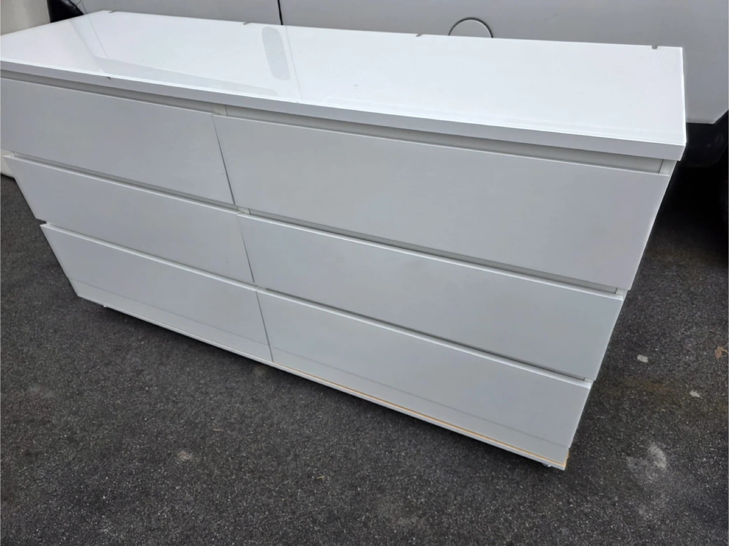 White 6-drawer dresser, perfect for organizing clothes or linens. It's got a clean, modern look and offers plenty of storage space. Dimensions are approximately 47 inches wide by 30 inches tall by 16 inches deep. Home delivery available