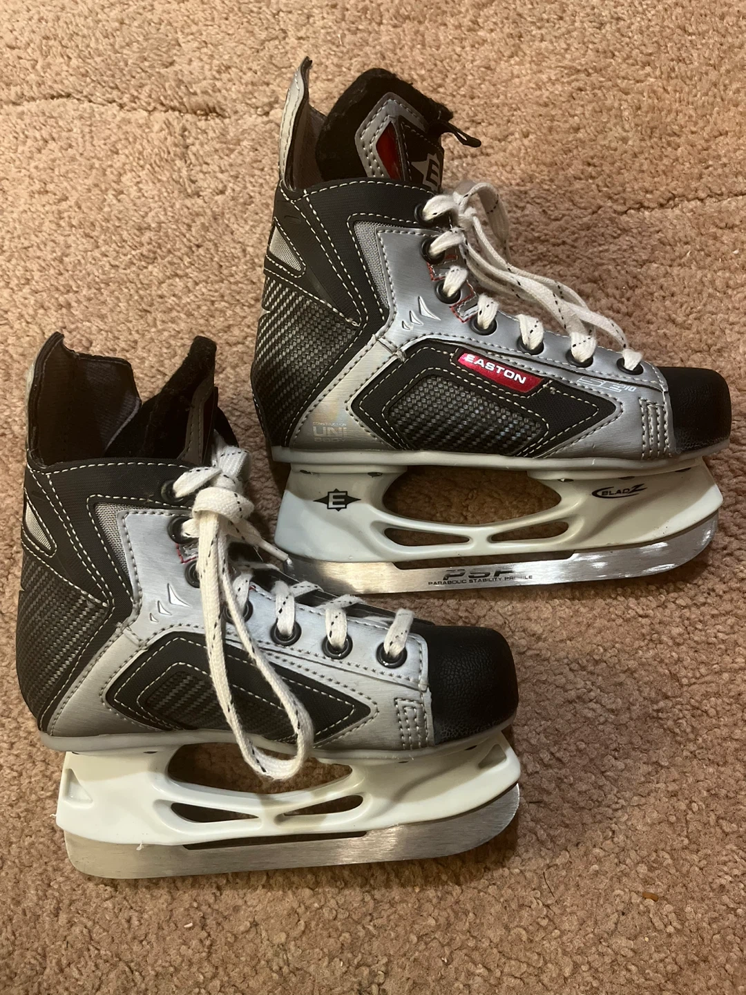 These Easton youth hockey skates are in a silver, black, and red colourway. They feature traditional lacing for a secure fit. Blade holder is labeled "PSF Parabolic Stability Profile".