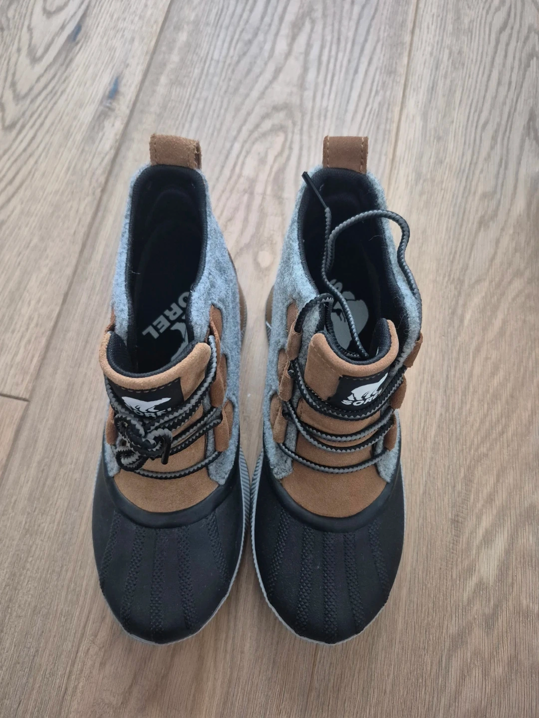 Cozy and rugged boots. Features gray and tan design.