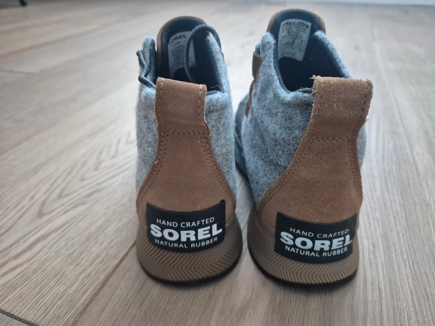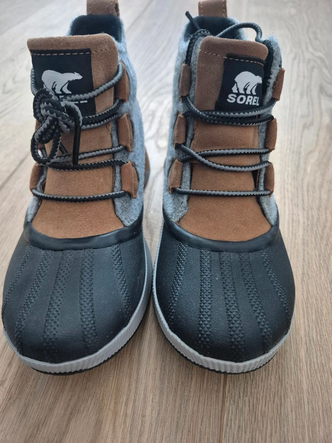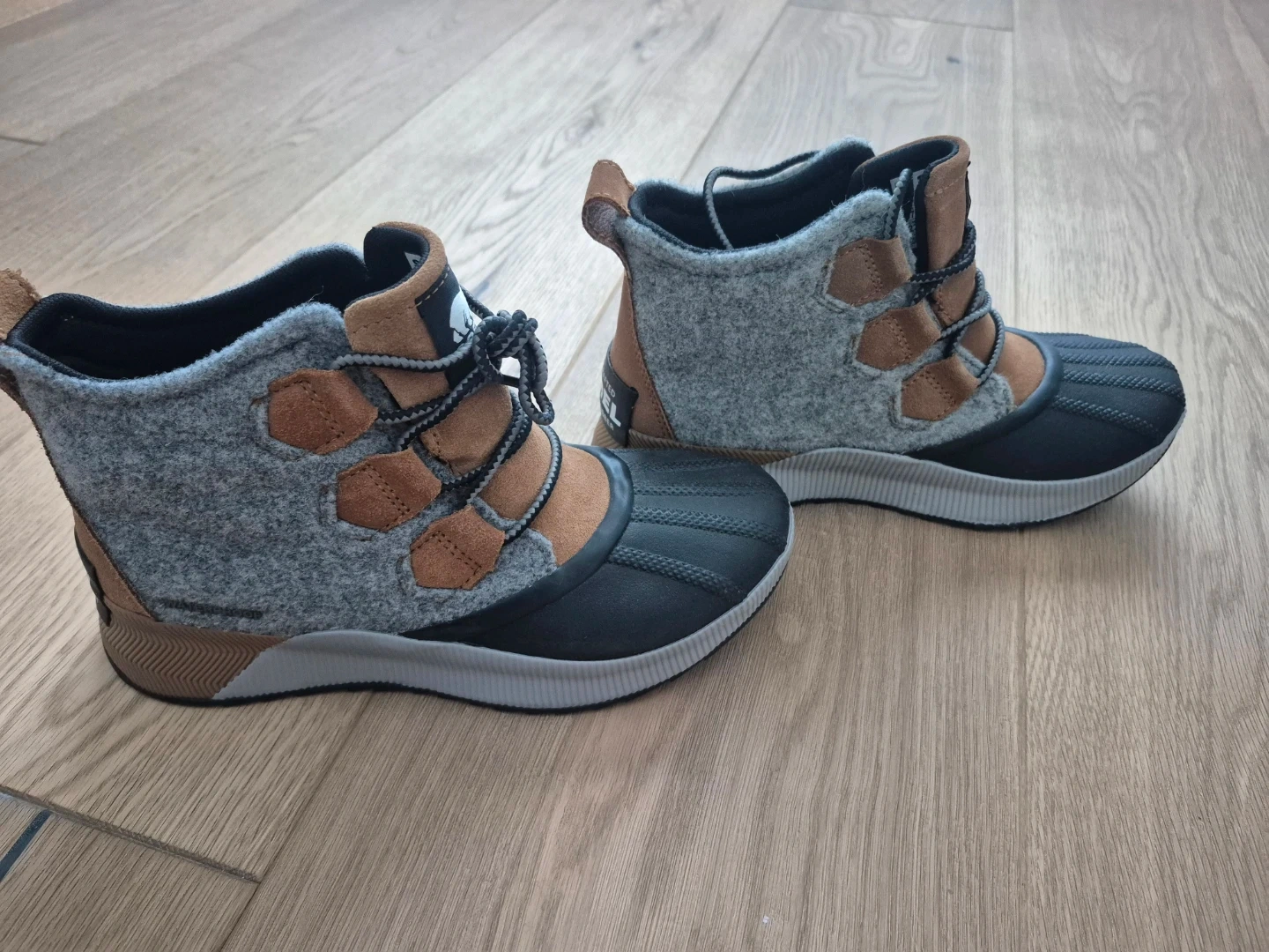 Cozy and rugged boots. Features gray and tan design.
