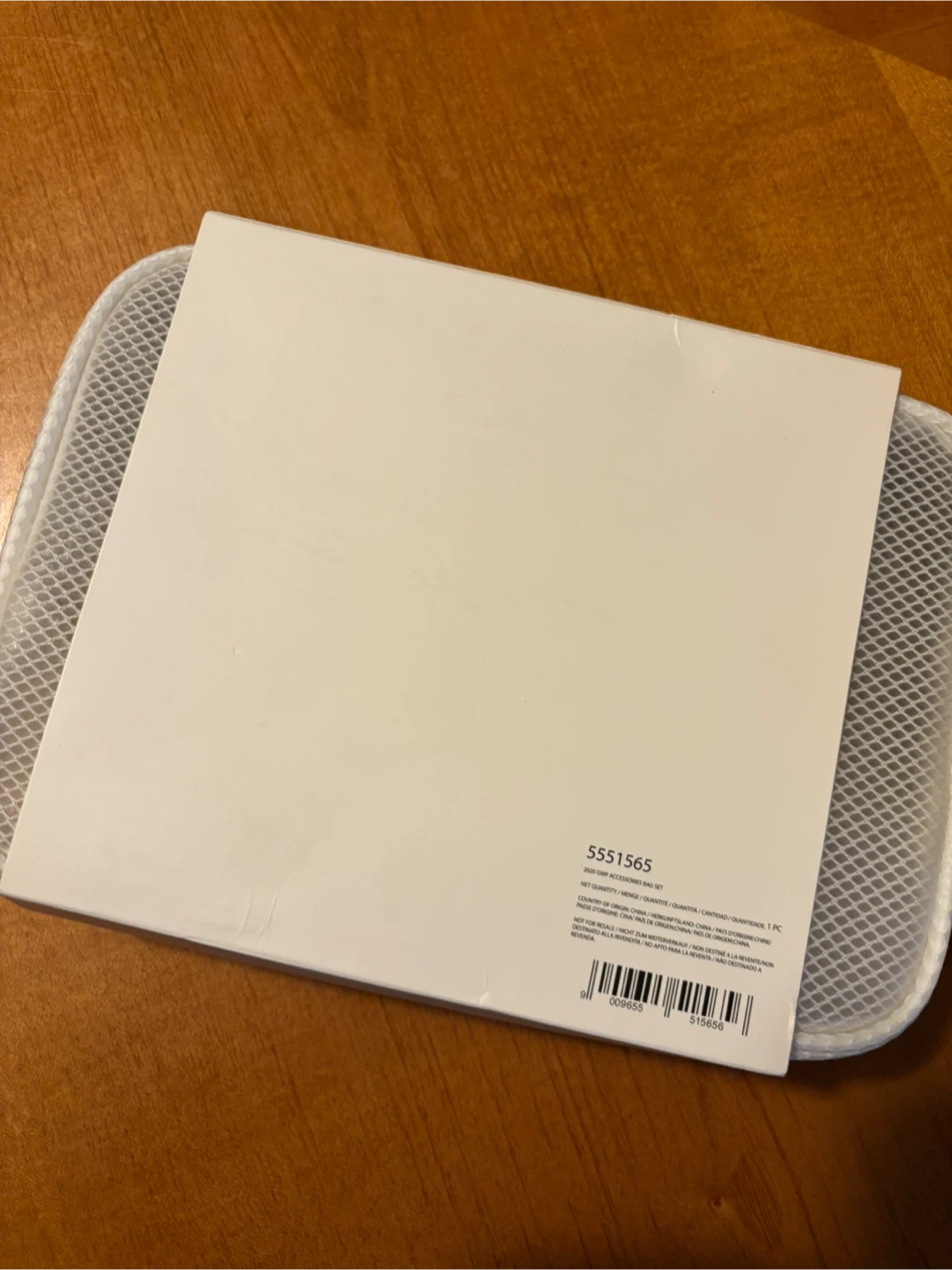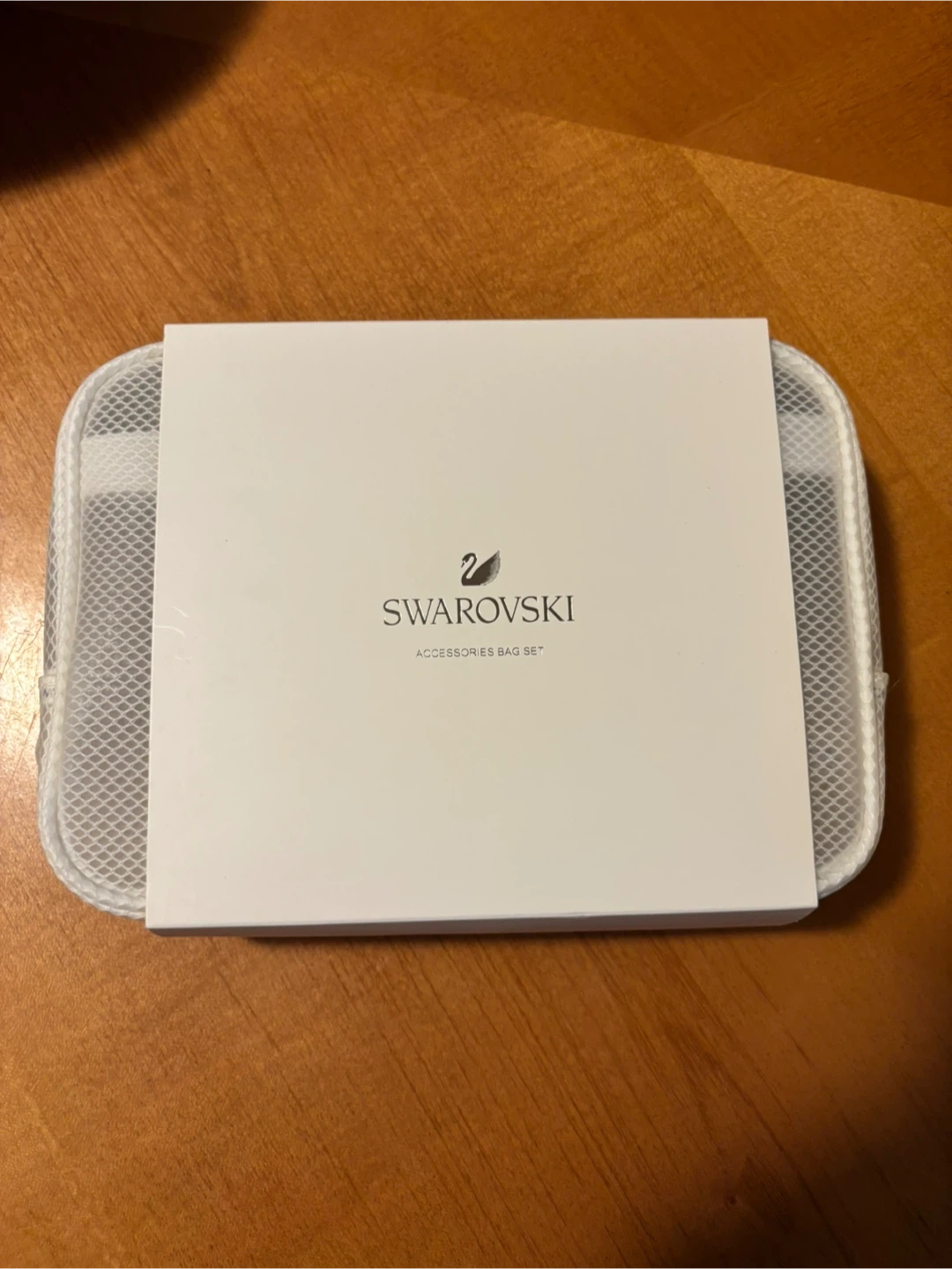 This is a Swarovski accessories bag set. It's made of white mesh material with a black zipper. It comes with its original packaging.