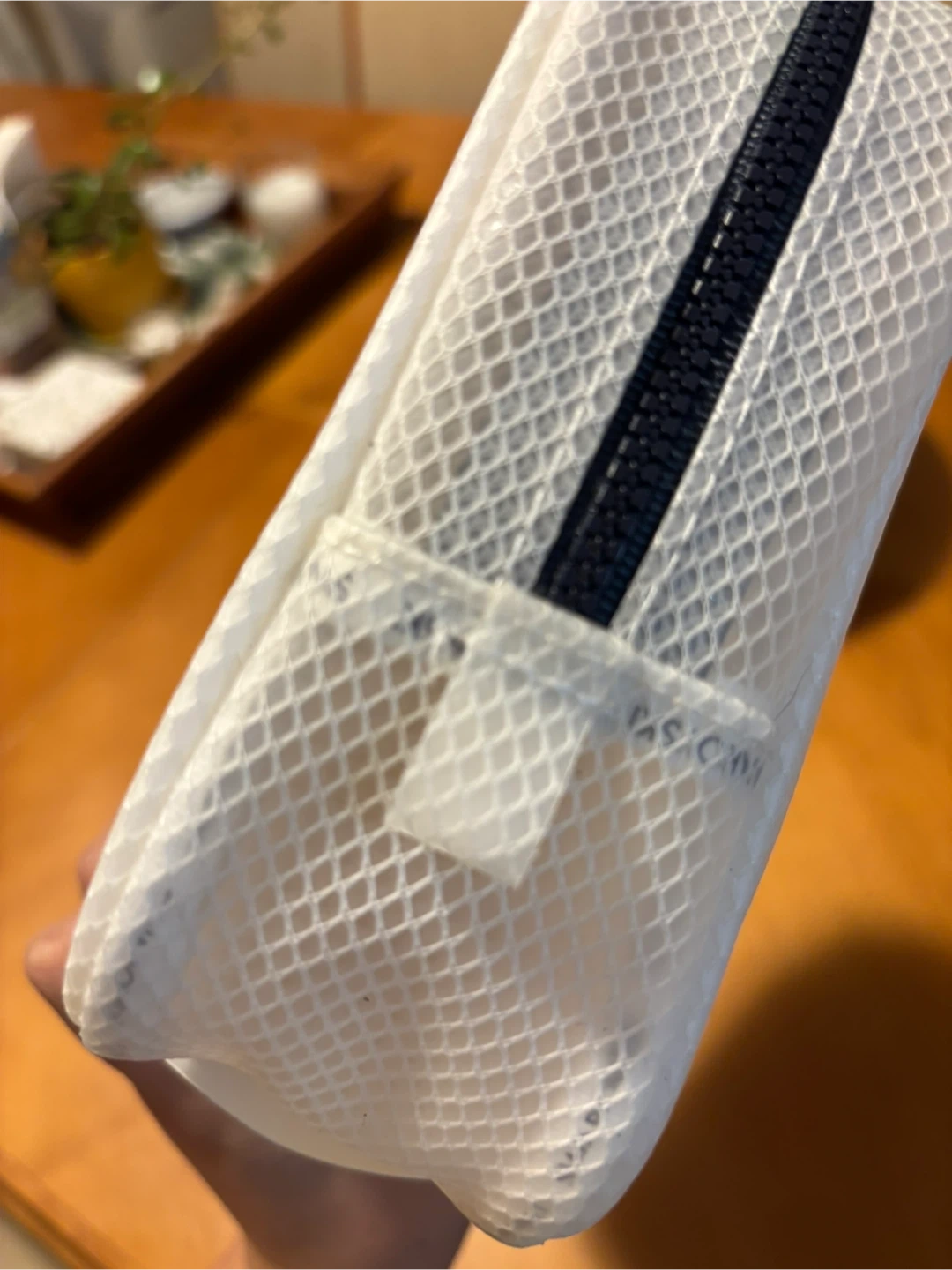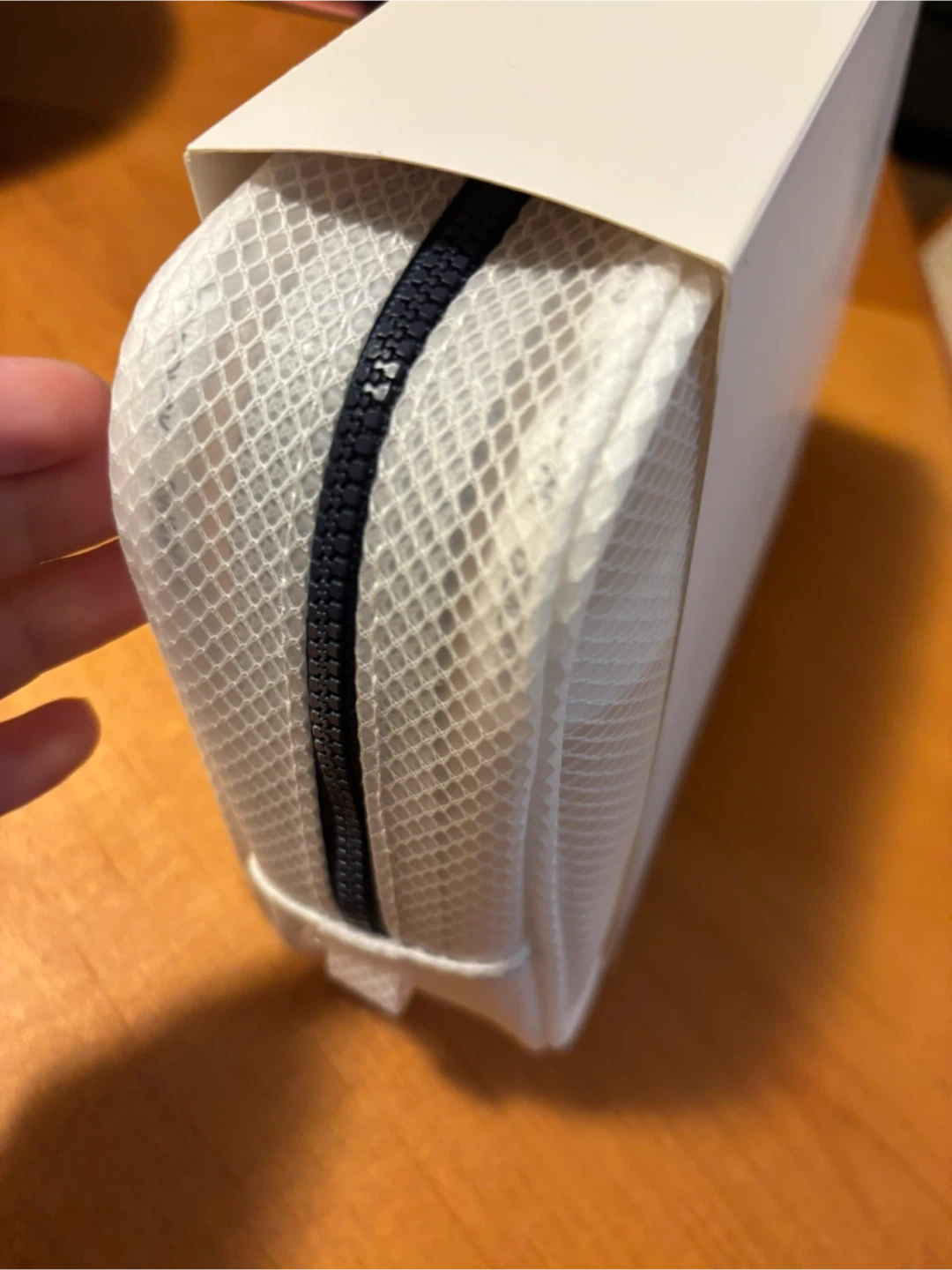 This is a Swarovski accessories bag set. It's made of white mesh material with a black zipper. It comes with its original packaging.