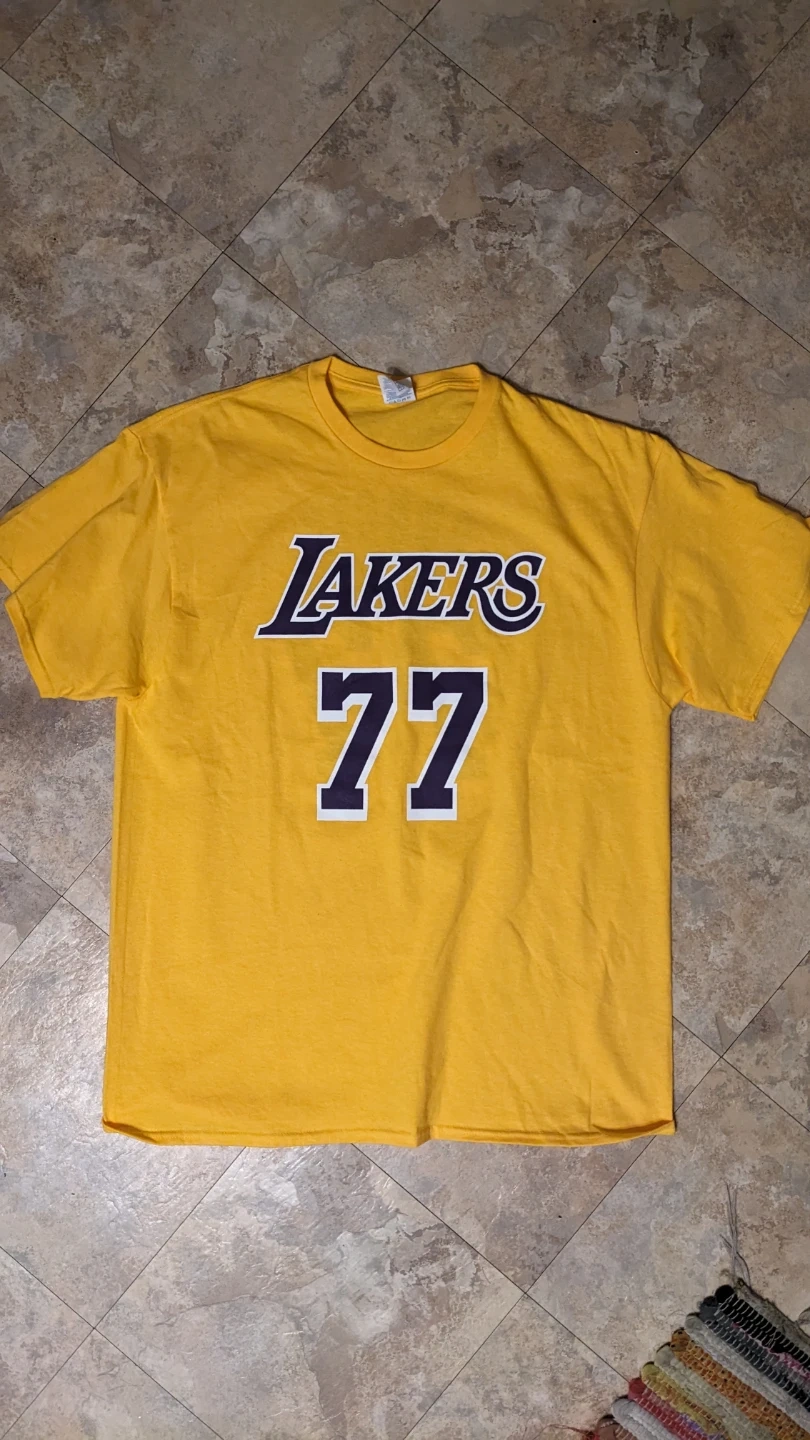 Los Angeles Lakers logo on the front and "Dončić" with the number "77" on the back. It's a size XL and made of cotton. Perfect for any basketball fan!