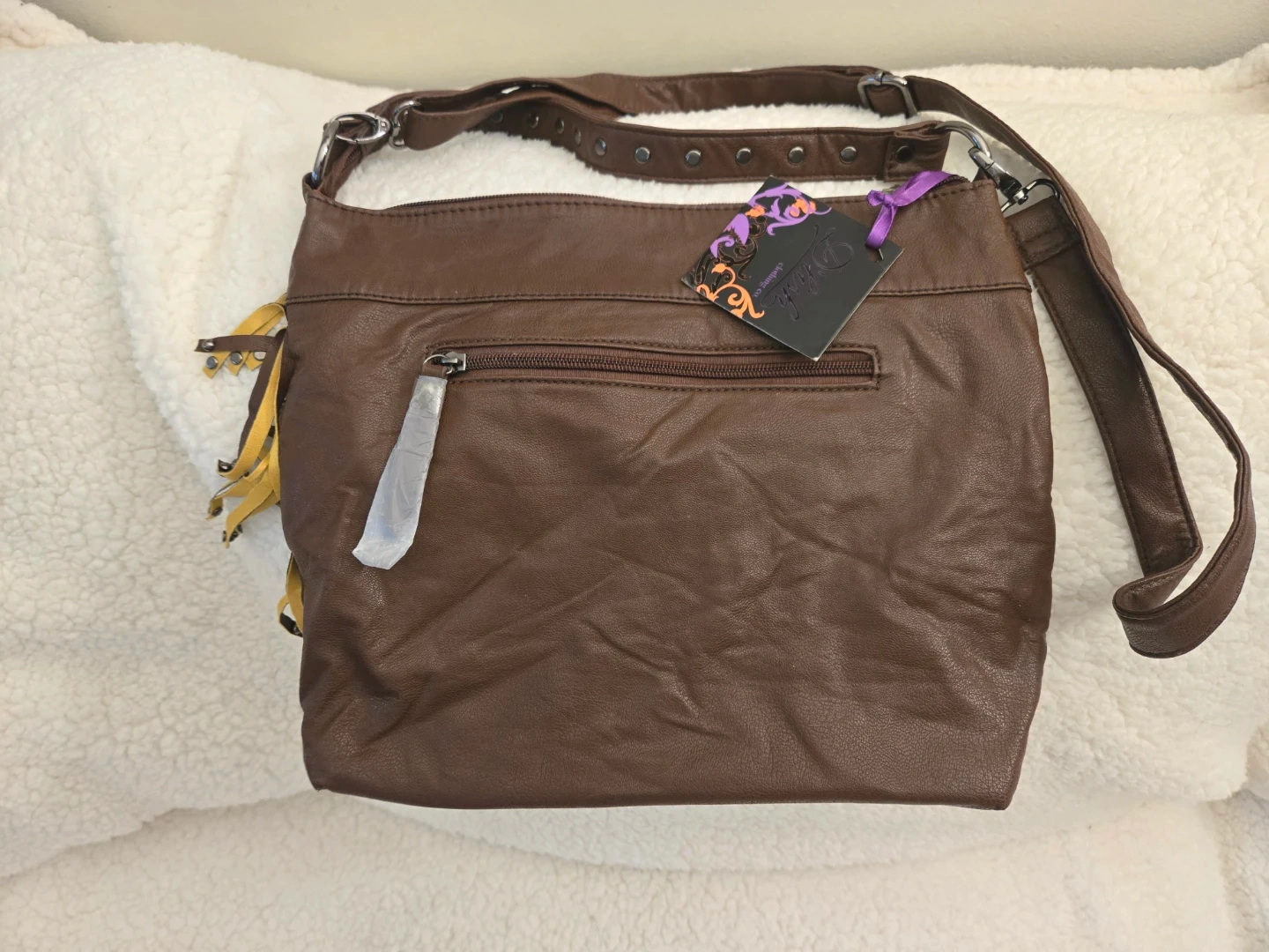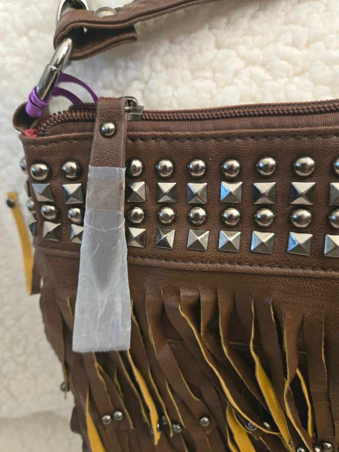 A brand new stylish brown faux leather crossbody purse with fringe detailing and stud accents.