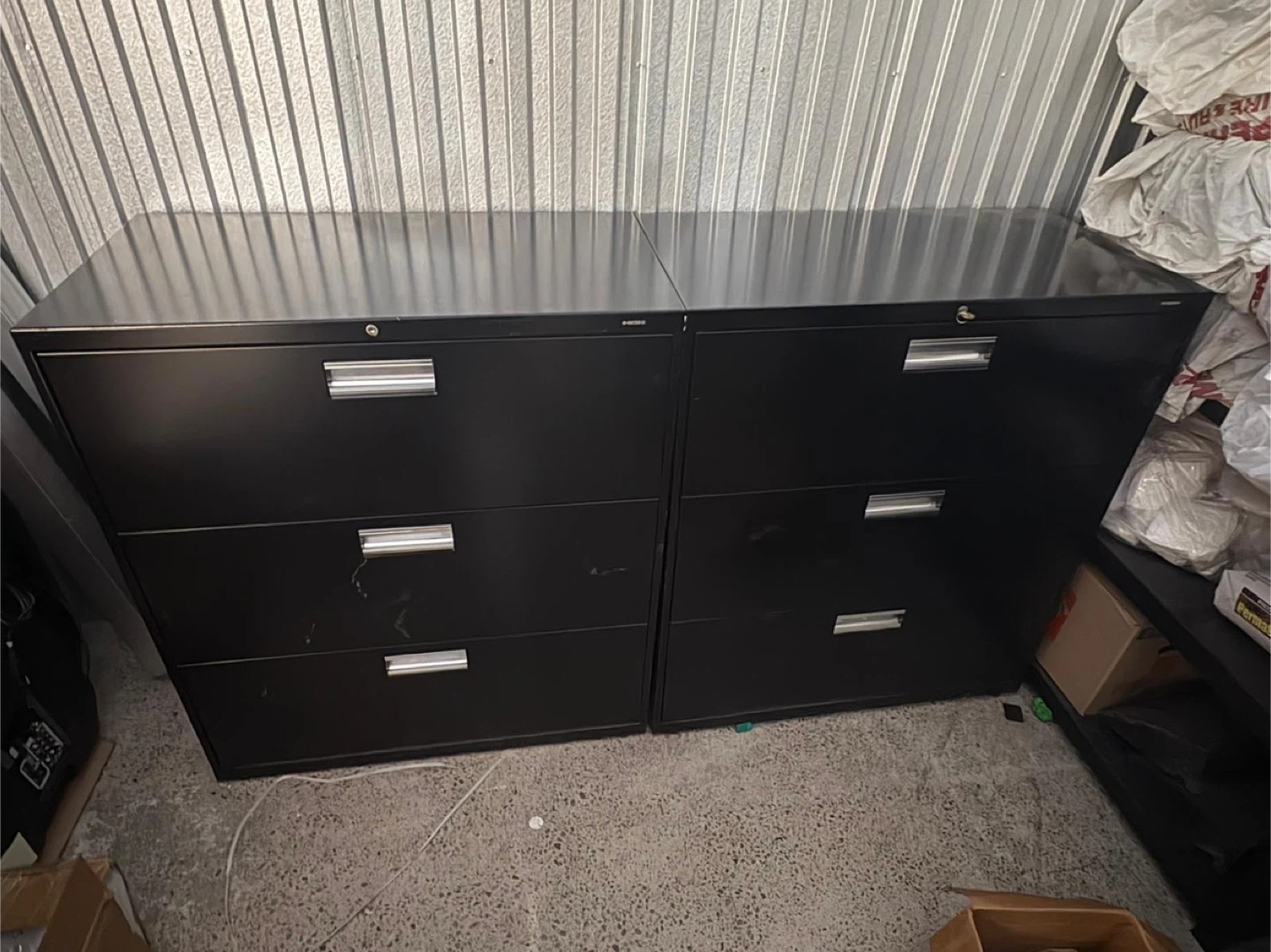 Two black metal filing cabinets are available. Each cabinet has three drawers with silver handles. They're made of metal and are black in colour. These would be useful for organizing office documents.