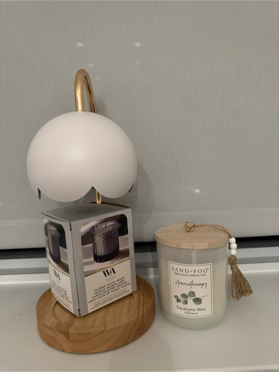 This is a Sand + Fog Aromatherapy candle in Eucalyptus Mint scent. It's hand-poured and comes in a glass jar with a wooden lid and tassel detail. A WA flower glass shade candle warmer lamp is also included in its original box.