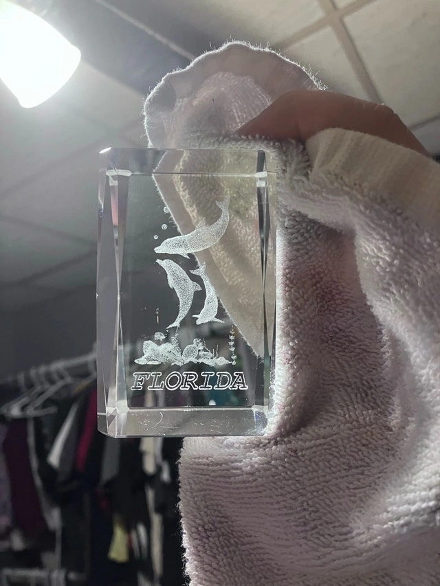 Small glass Florida etching. Minimal scratches on the bottom (visible in pictures) and a tiny chip on one edge (also pictured), but both are barely noticeable when displayed. Cash preferred, but e-transfer is also accepted. Pick up in Pelham.
