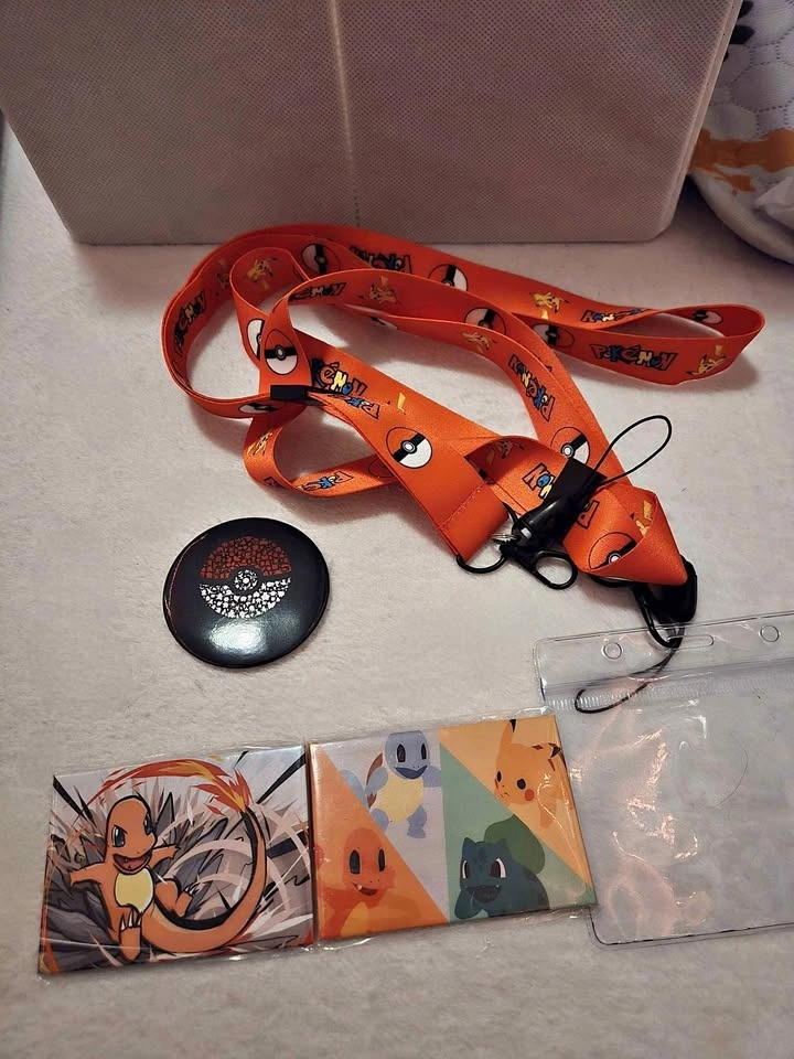 Includes: Lanyard: Bright red with Pikachu and classic Pokéball patterns. Includes a clear ID badge holder. Large Magnets/Pins: Two rectangular designs featuring Charmander and the Kanto Starters (Pikachu, Squirtle, Bulbasaur, Charmander). Pokéball Pin: Classic round button with a stylized Pokéball design. Price: $10