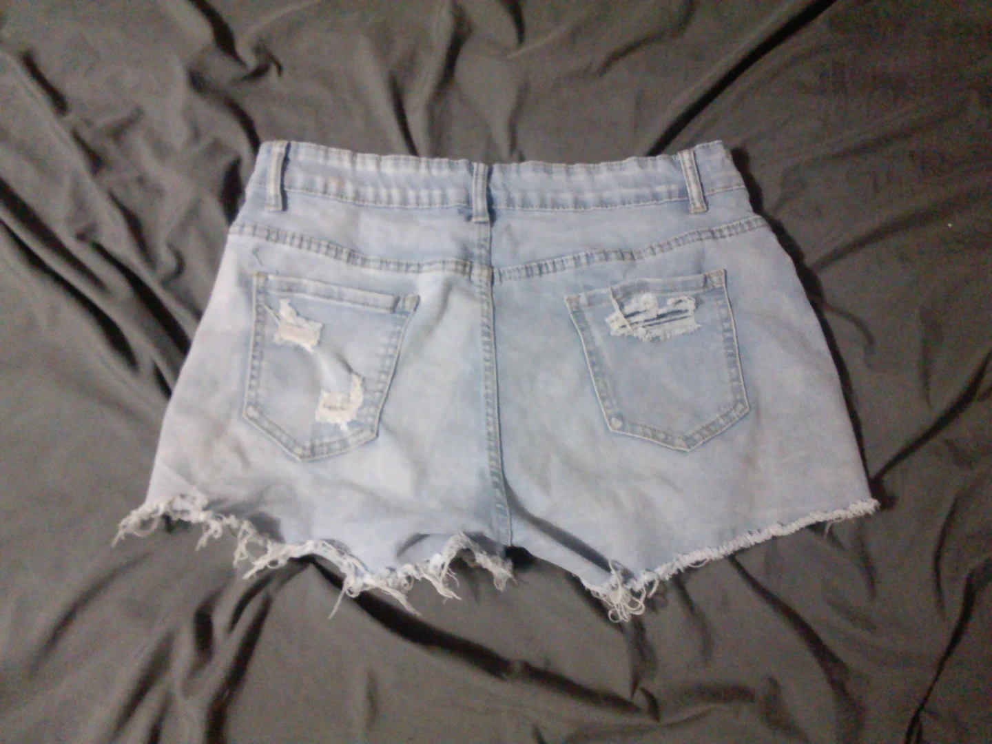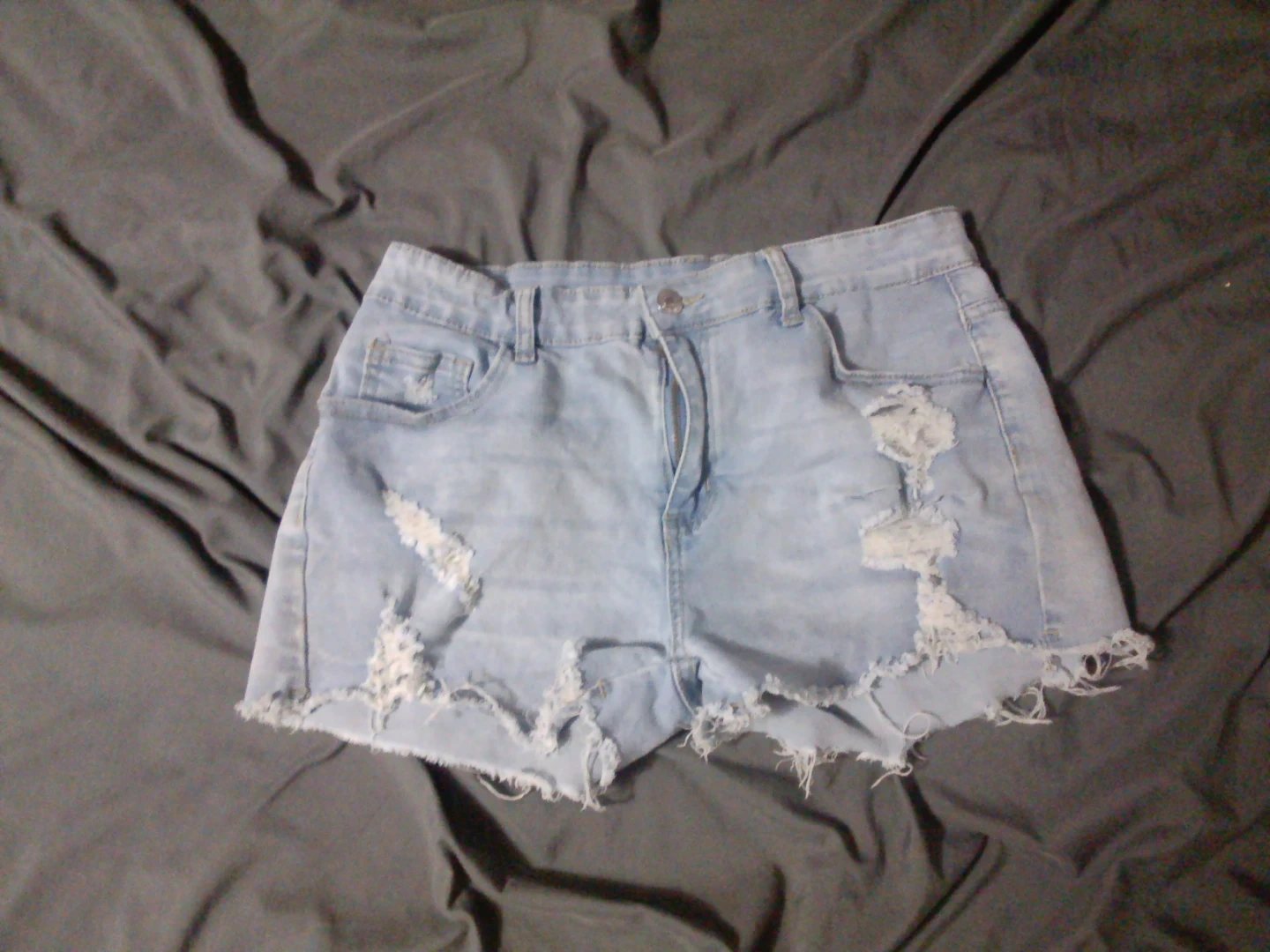 Light wash denim shorts with distressed ripped detailing and a frayed hem. These shorts have a classic five-pocket design. They're great for casual wear in warmer weather!